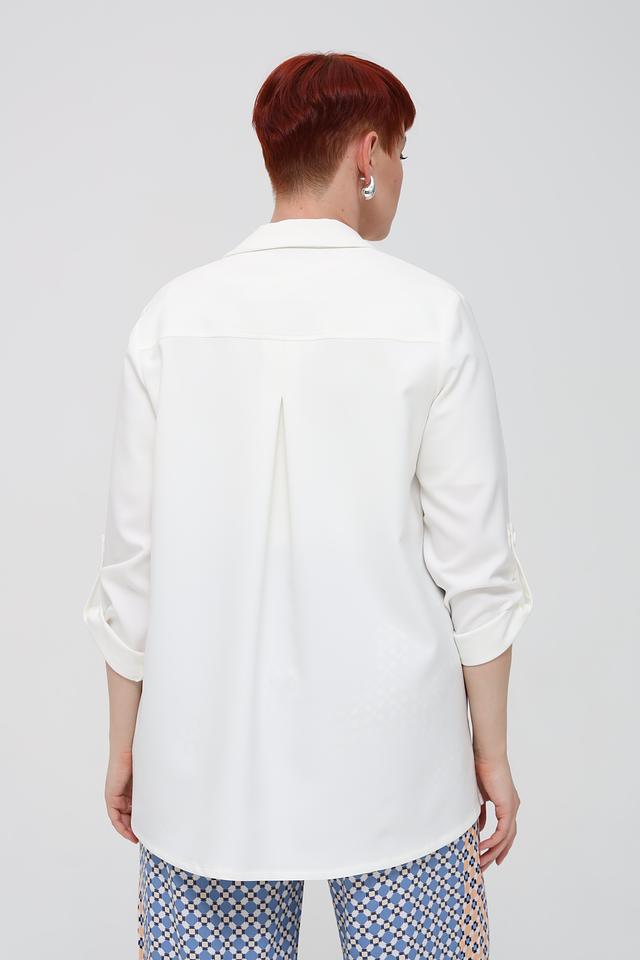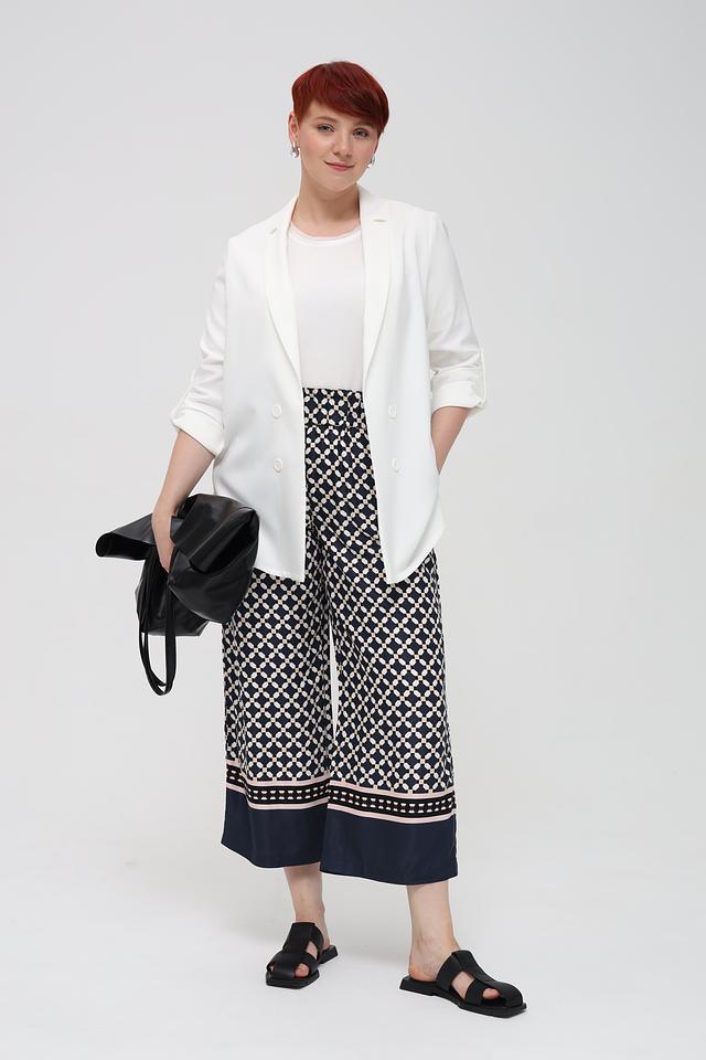 Жакет имеет прямой крой, который подчеркивает фигуру, не сковывая движений. Застежка на две пуговицы позволяет регулировать посадку по фигуре. Рукава 3/4 с небольшим отворотом добавляют образу изысканности.
