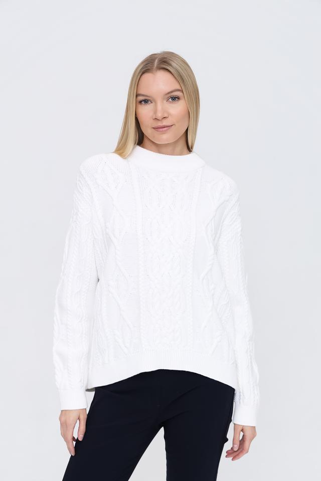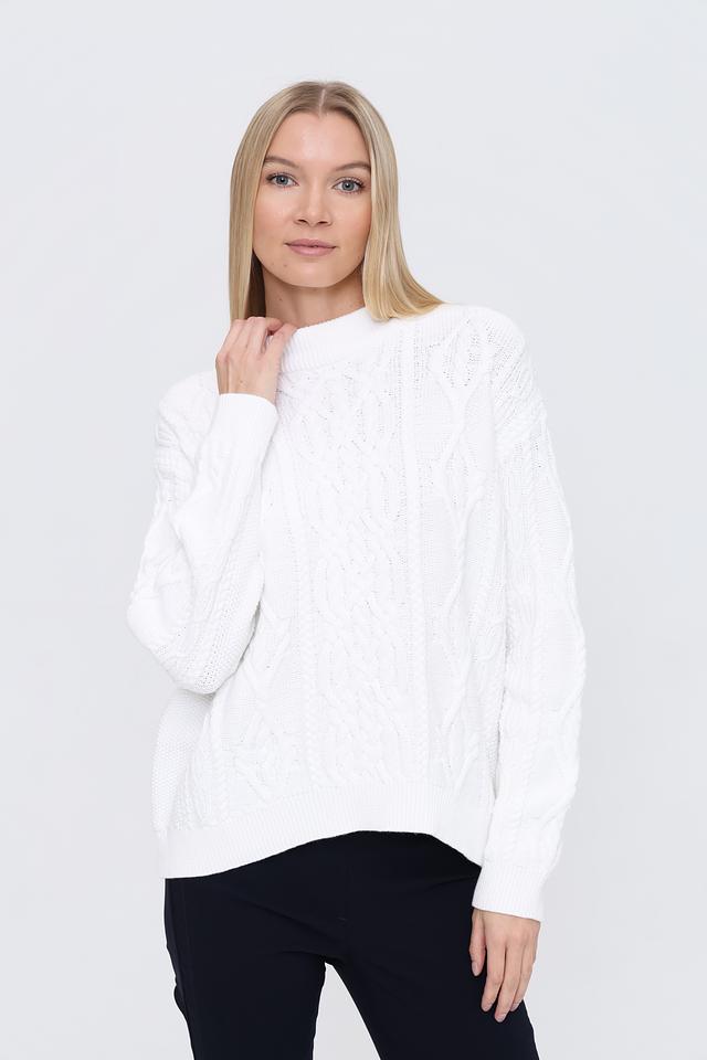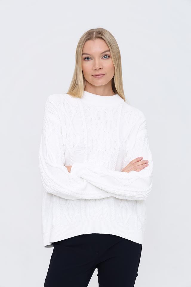 Основной цвет пуловера – белый, что делает его универсальным элементом гардероба, легко сочетаемым с различными вещами. Выразительный узор из кос добавляет изделию текстуру и визуальный интерес.