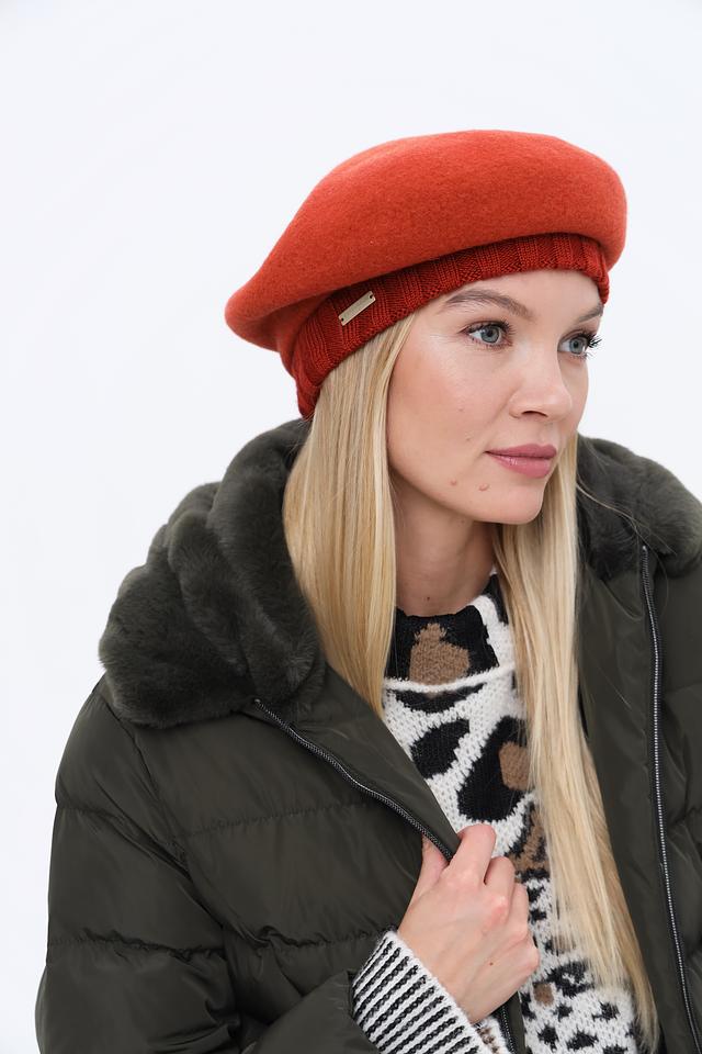 Берет имеет классическую форму и насыщенный рыжий цвет, который легко сочетается с различными стилями одежды. Аккуратный дизайн и высокое качество материалов делают этот аксессуар не только практичным, но и стильным.