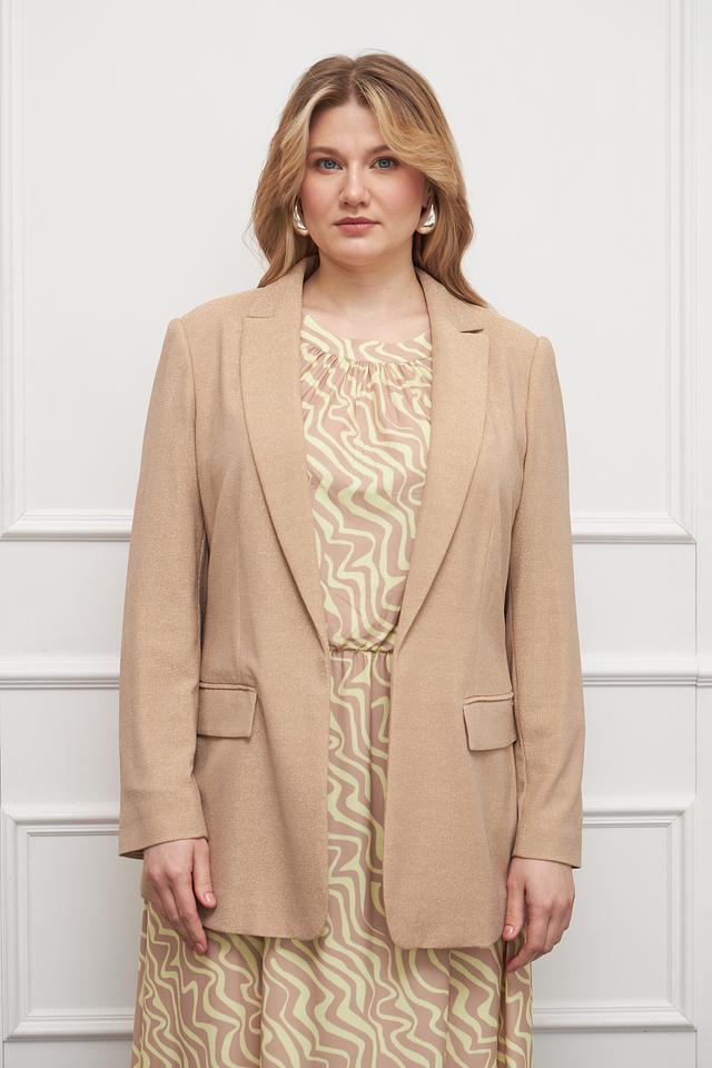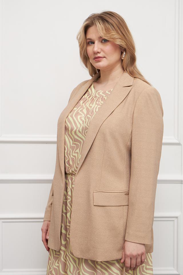 Бежевый жакет Betty and Co – это стильное и универсальное решение для создания элегантного образа. Прямой крой и лаконичный дизайн делают его подходящим для различных случаев. Жакет выполнен из качественного материала с добавлением полиэстера и эластана. Состав: полиамид 75%, метализ.полиэстер 21%, эластан 4%