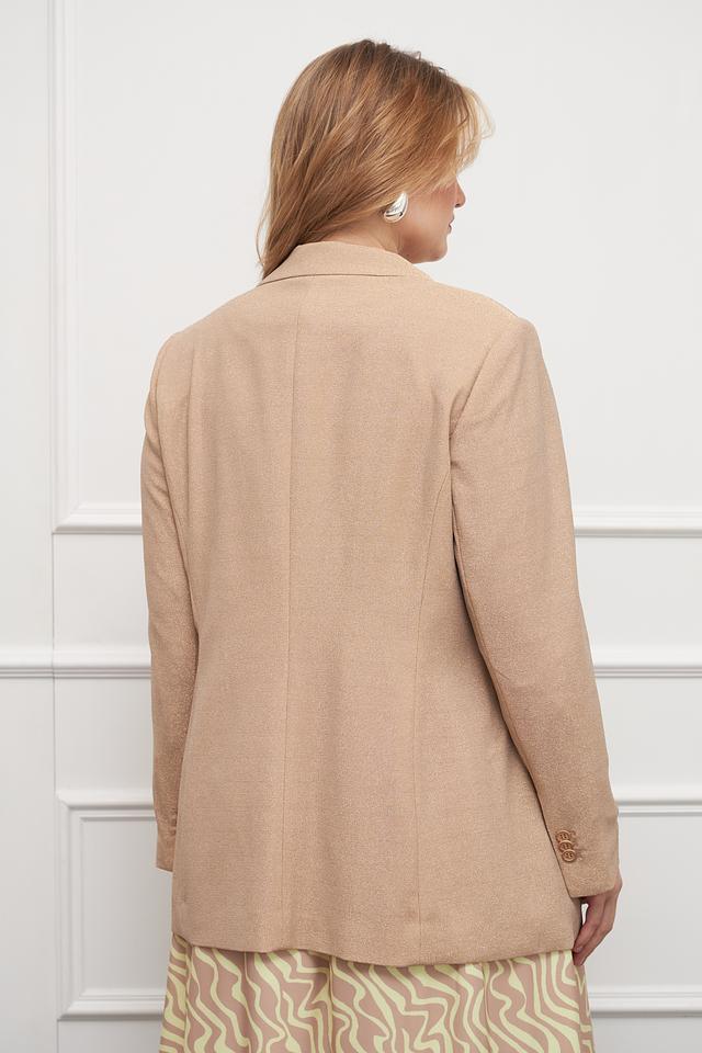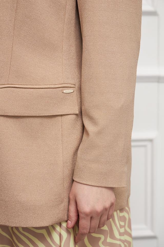 Жакет имеет классический прямой крой, который подчеркивает фигуру и обеспечивает комфортную посадку. Застежка отсутствует, что придает модели непринужденный вид. Длинные рукава и лацканы добавляют жакету элегантности.