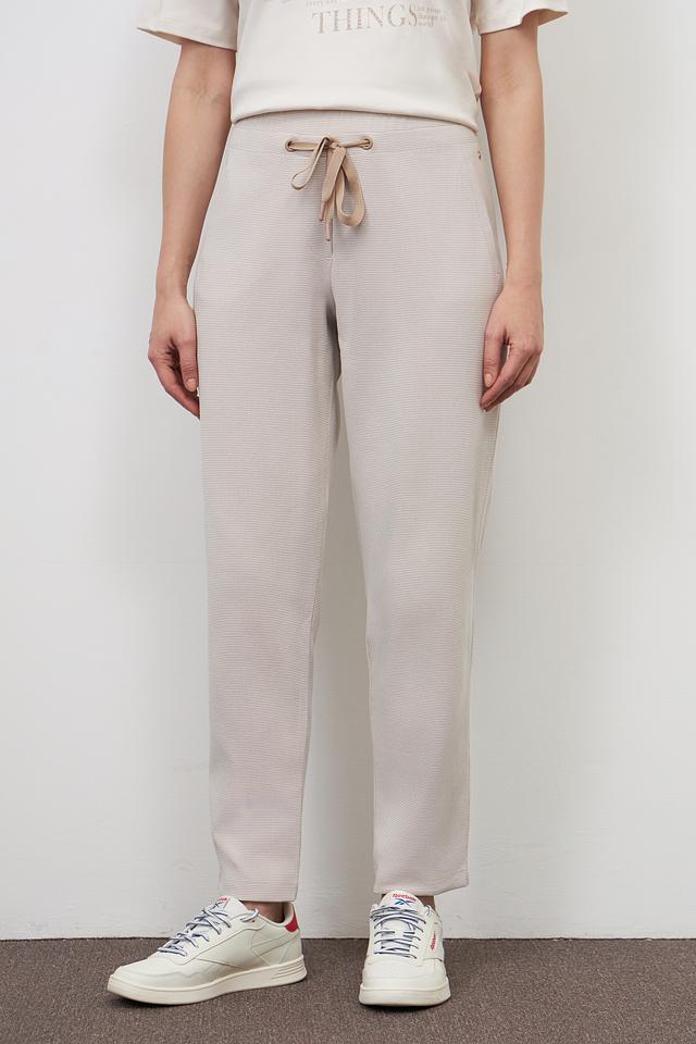 Бежевые трикотажные брюки от Betty and Co — удобная и стильная модель с эластичным поясом и завязками. Идеальный выбор для создания повседневных образов, сочетающих комфорт и актуальный дизайн. Состав: хлопок 51%, полиэстер 46%, эластан 3%