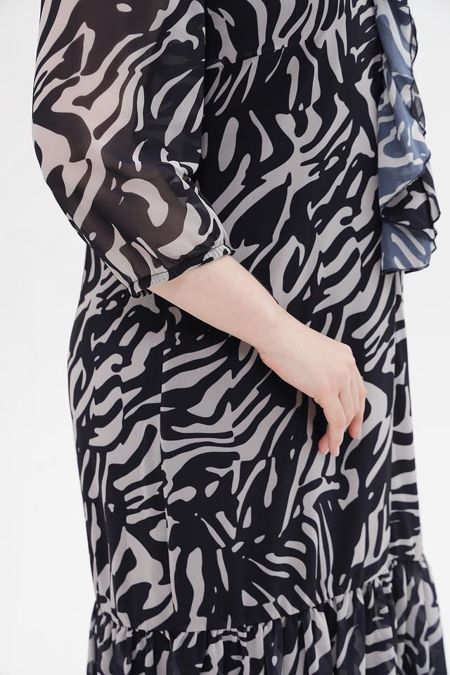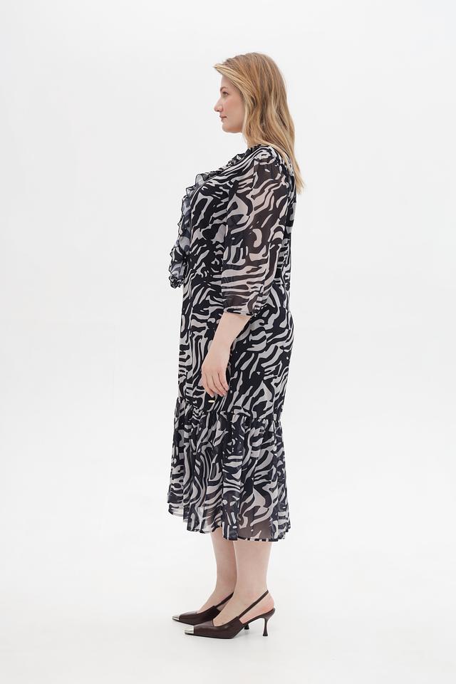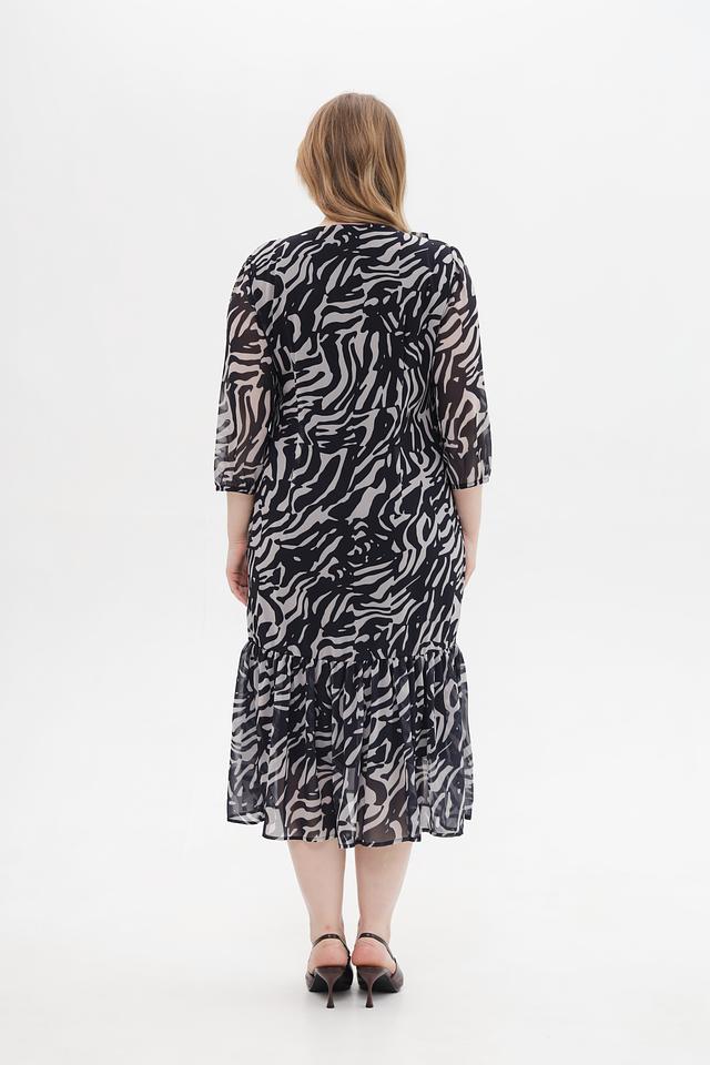 Это платье от Betty and Co – идеальный выбор для тех, кто ценит комфорт и оригинальный дизайн. Платье выполнено в черном цвете с эффектным принтом, имитирующим шкуру зебры, что делает его ярким и запоминающимся.