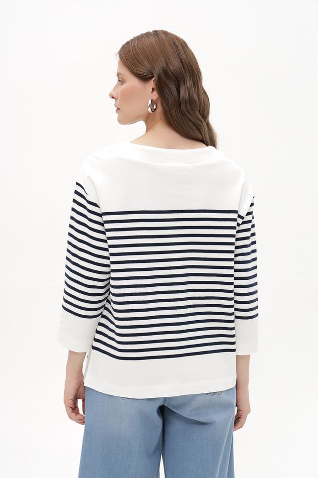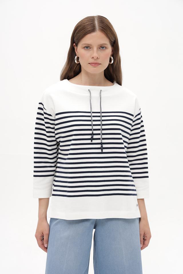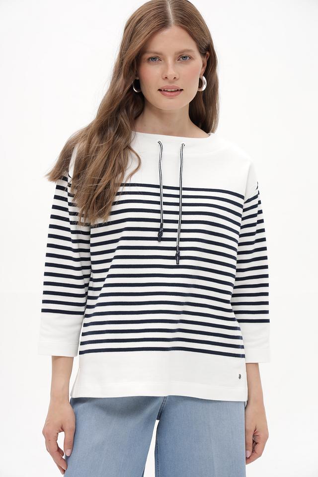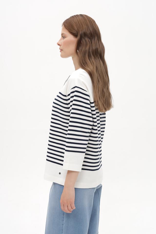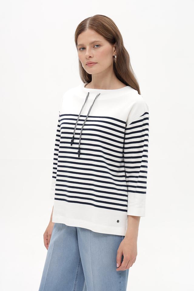 Женский пуловер Betty and Co белого цвета с классической горизонтальной полоской. Модель выполнена из мягкого хлопка с добавлением эластана для комфортной посадки. Удобный крой и стильный дизайн. Состав: хлопок 97%, эластан 3%
