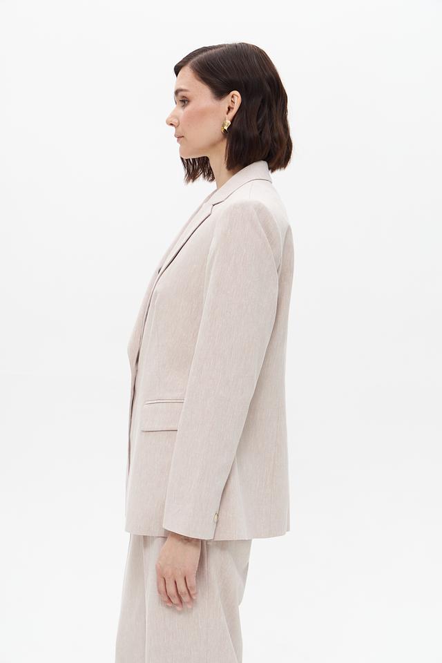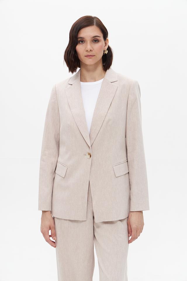Жакет Betty and Co бежевого цвета – стильная и универсальная модель прямого кроя. Выполнен из смесовой ткани с добавлением льна и хлопка, что обеспечивает комфорт и воздухопроницаемость. Застежка на одну пуговицу. Состав: переработ.полиэстер 31%, лен 28%, хлопок 22%, вискоза 17%, эластан 2%