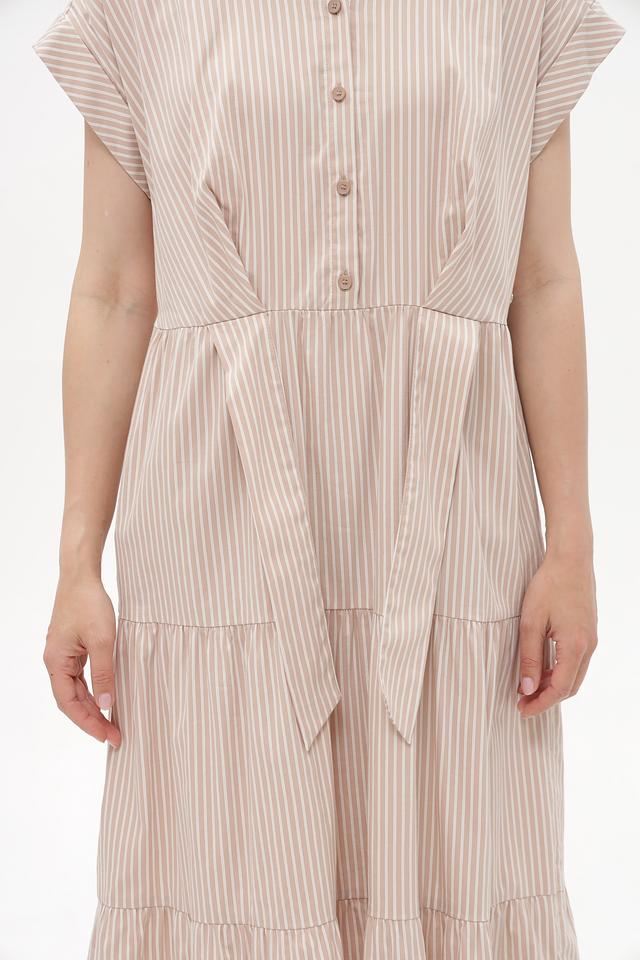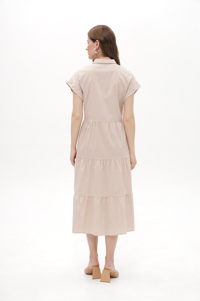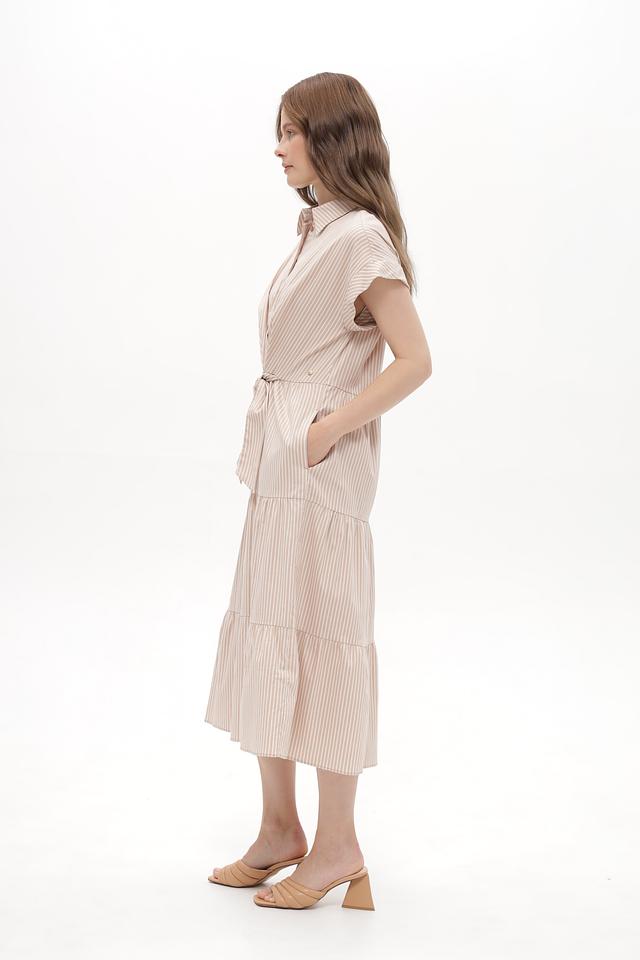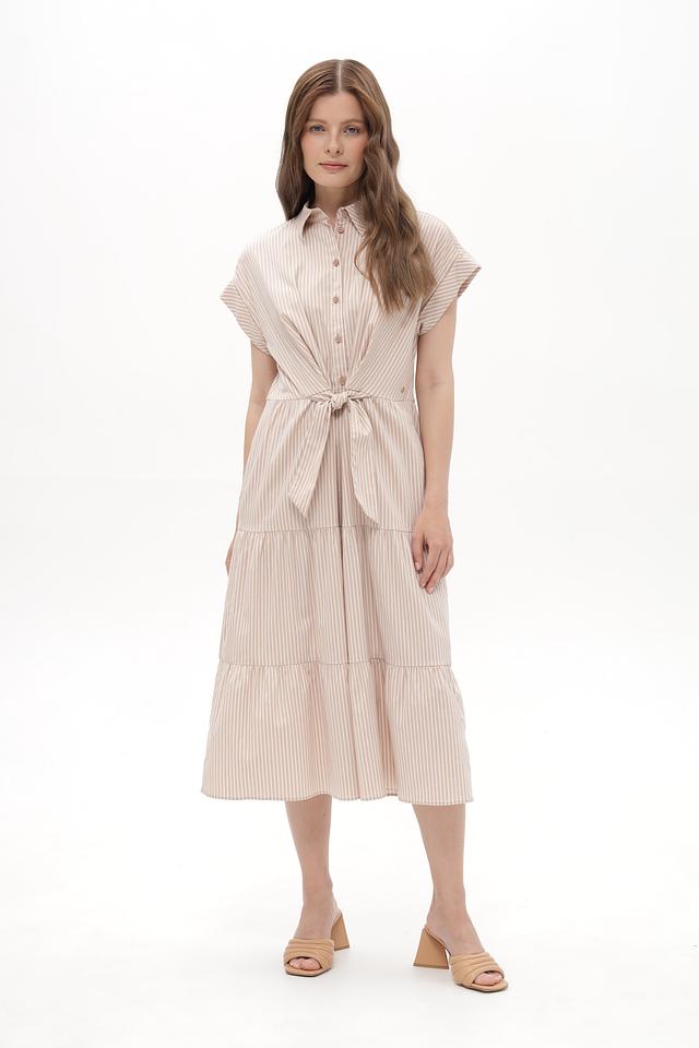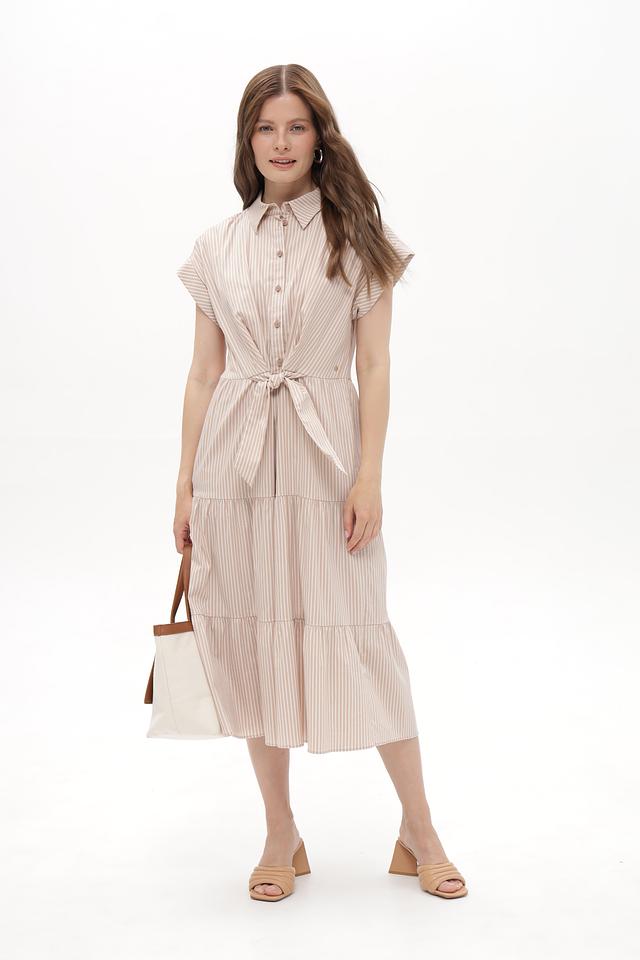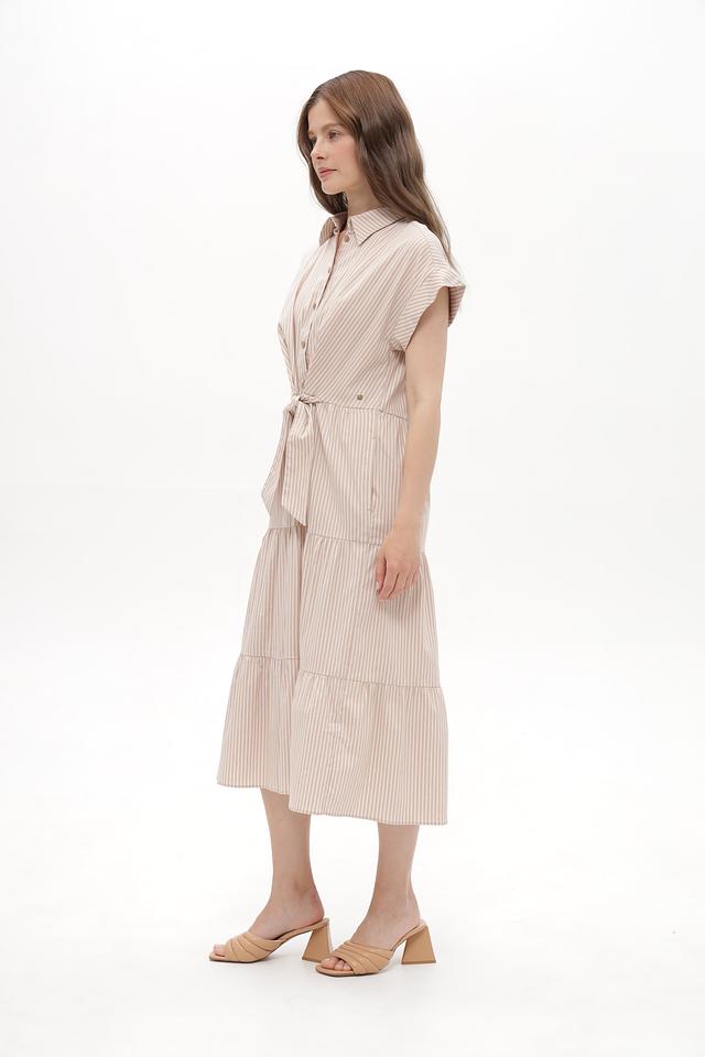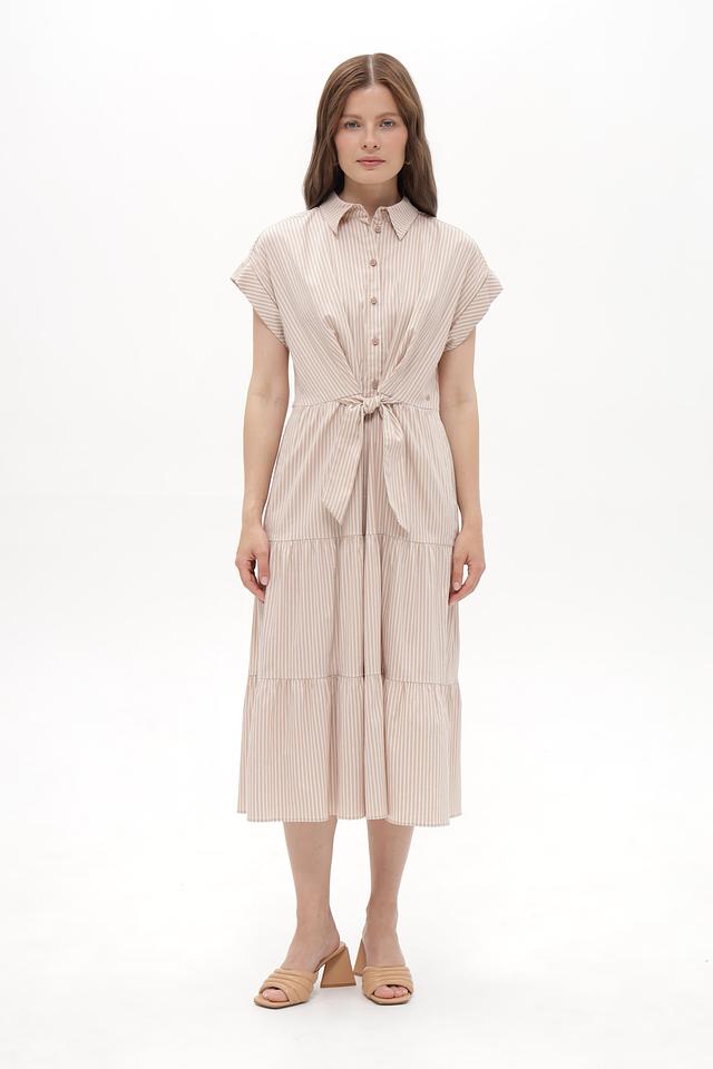 Это платье от Betty and Co выполнено в полоску, сочетающую бежевый и светло-коричневый цвета. Модель имеет прямой крой, воротник рубашка и застежку на пуговицы по всей длине.