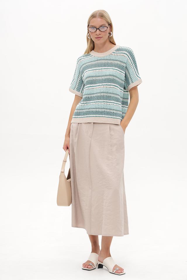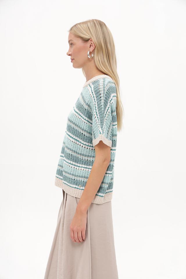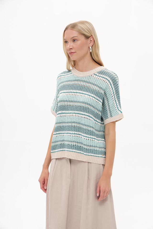 Этот стильный пуловер от Betty and Co выполнен в актуальной полосатой расцветке, сочетающей различные оттенки бирюзового и бежевого. Модель имеет свободный крой и короткие рукава, что делает ее идеальным выбором для теплой погоды.