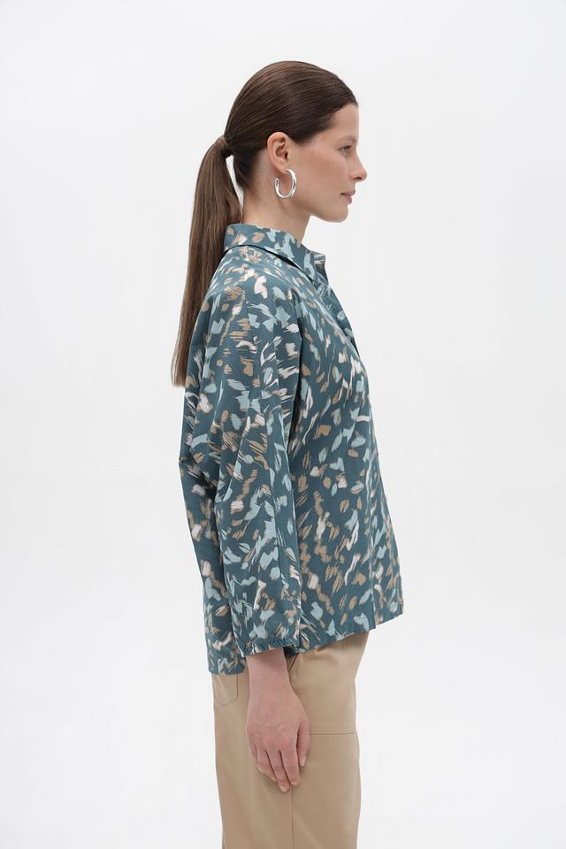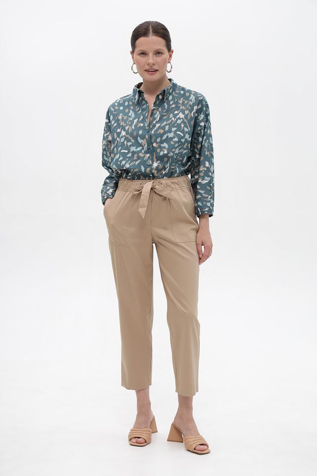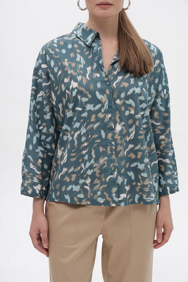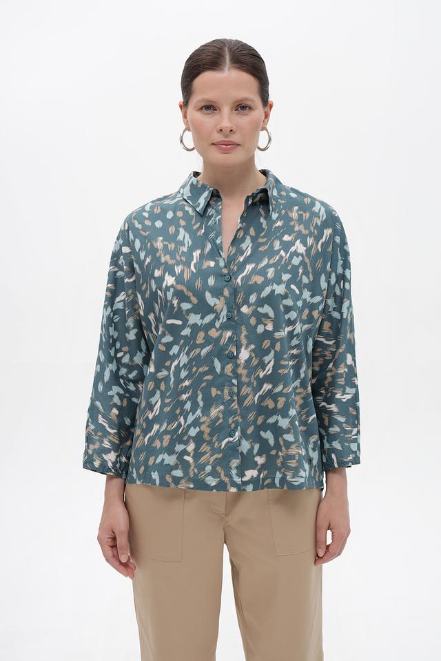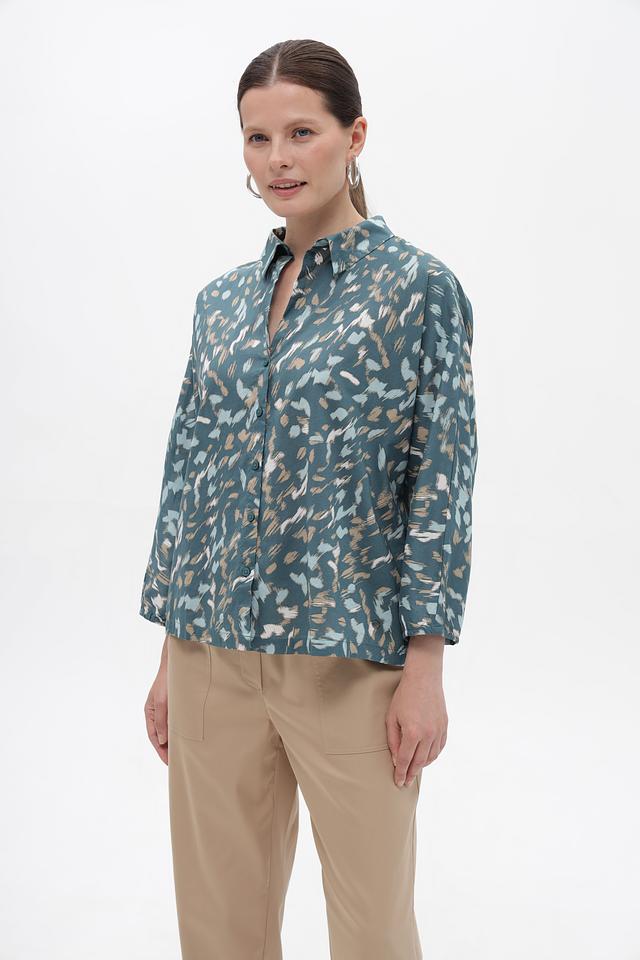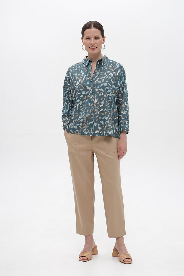 Особенностью этой блузы является ее яркий принт, выполненный в зеленых, бежевых и коричневых тонах. Этот принт добавляет образу оригинальности и индивидуальности. Блуза идеально сочетается с брюками, юбками и джинсами, позволяя создавать разнообразные стильные образы.