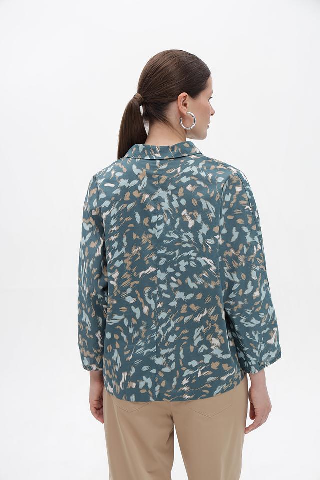 Блуза имеет свободный крой, который не сковывает движения. Воротник рубашечного типа и застежка на пуговицы придают ей классический вид. Рукава 3/4 делают ее универсальной для любого времени года.