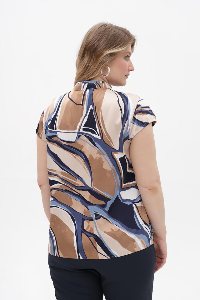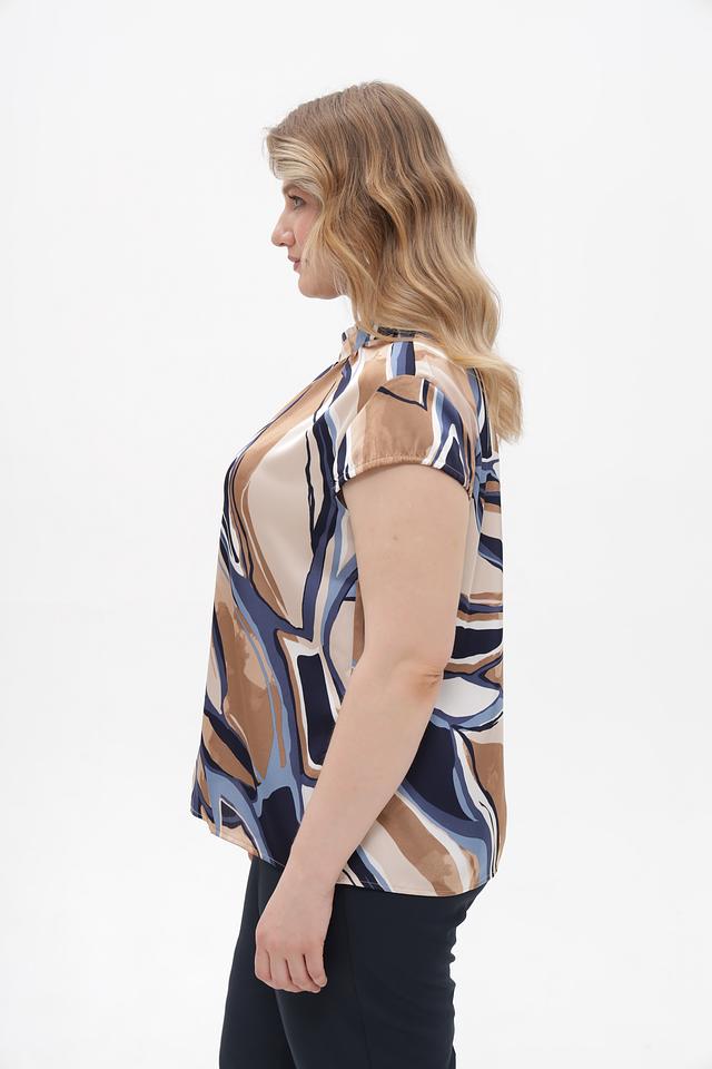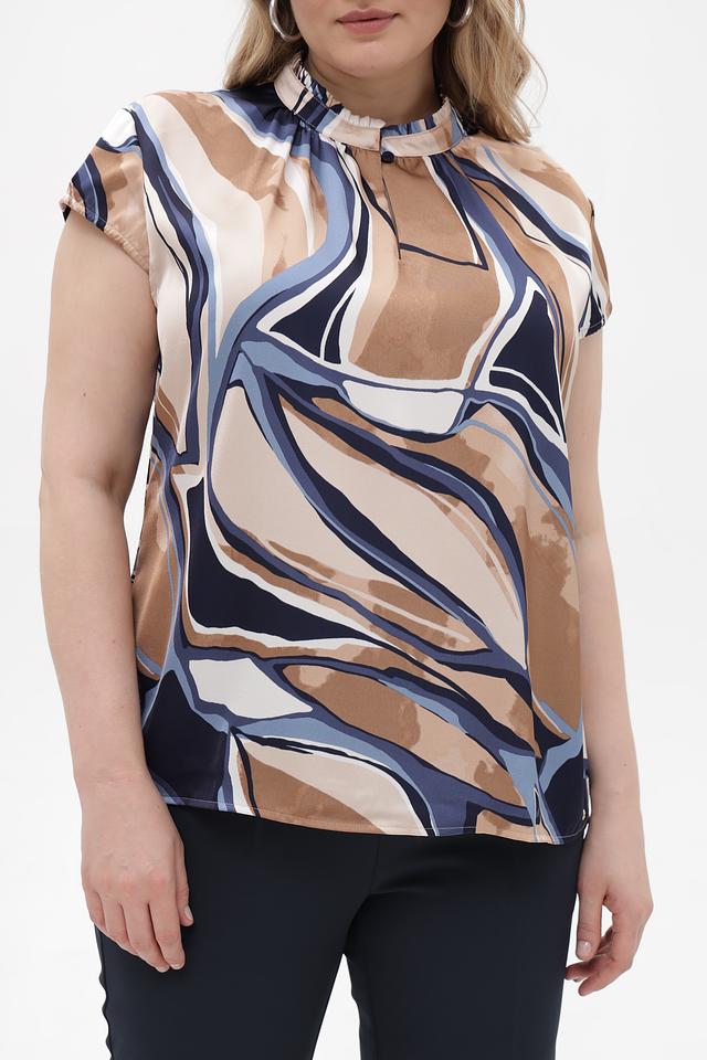 Особенностью данной модели является яркий абстрактный принт в бежевых, синих и коричневых тонах, который добавит образу оригинальности. Воротник-стойка с небольшим разрезом и оборкой придает блузке элегантный вид.
