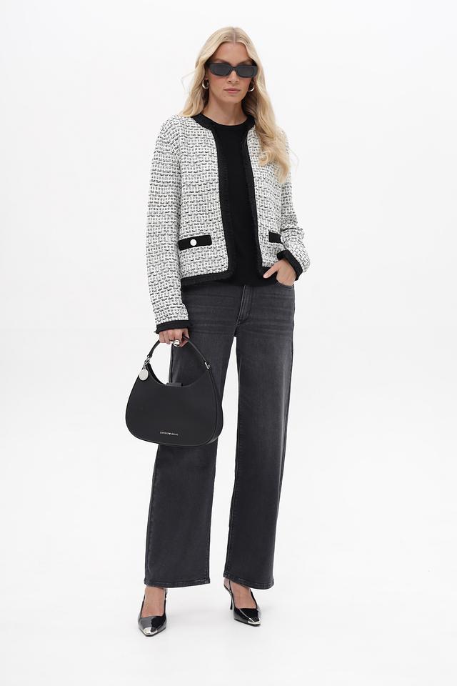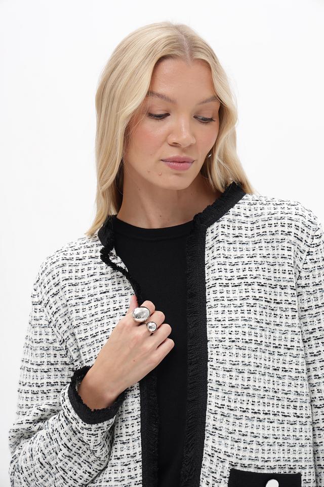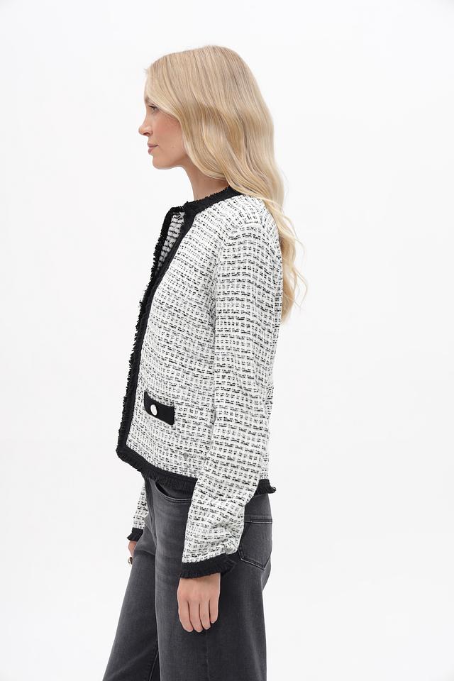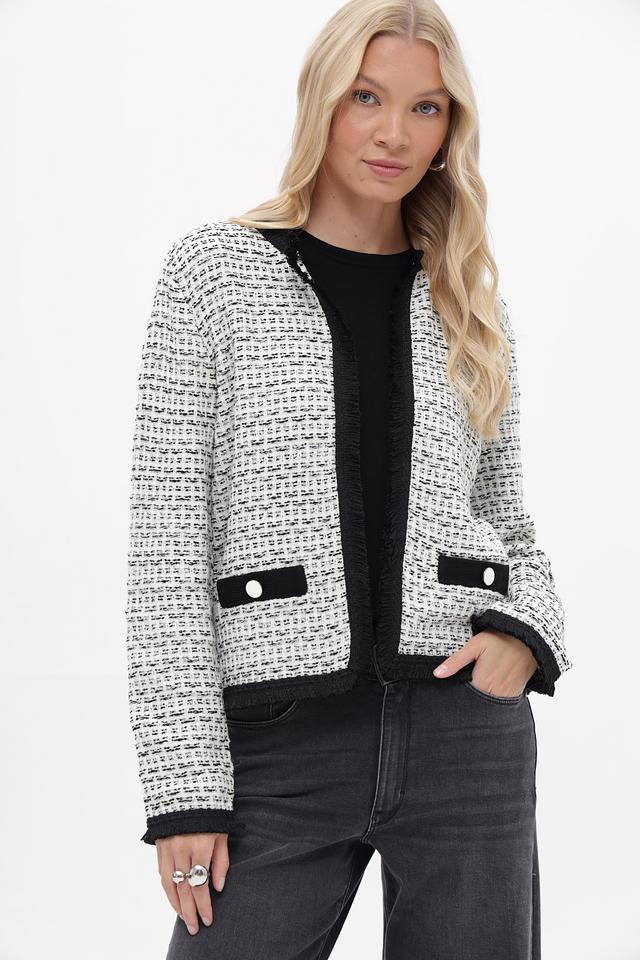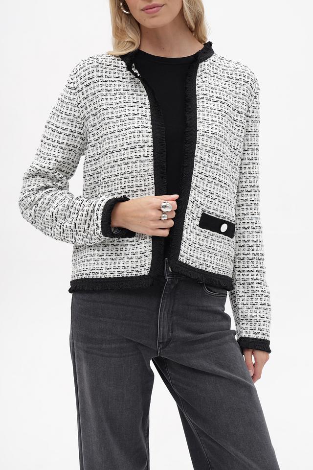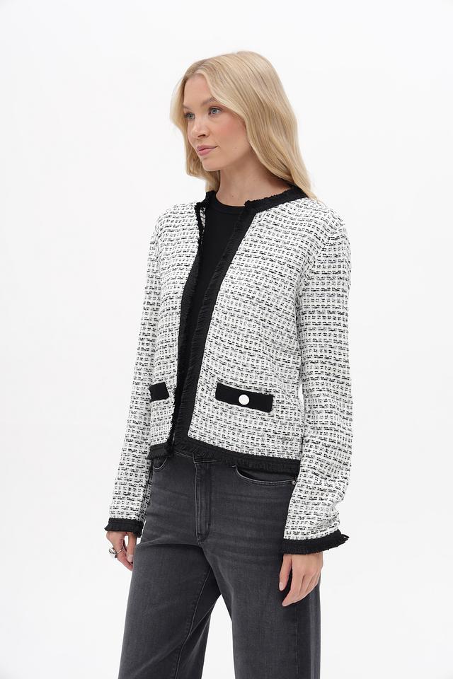 Жакет Betty and Co чёрно-белого цвета – стильная модель с твидовой фактурой и отделкой бахромой. Изготовлен из полиакрила и полиамида, обеспечивающих комфорт и долговечность. Состав: полиакрил 72%, полиамид 28%