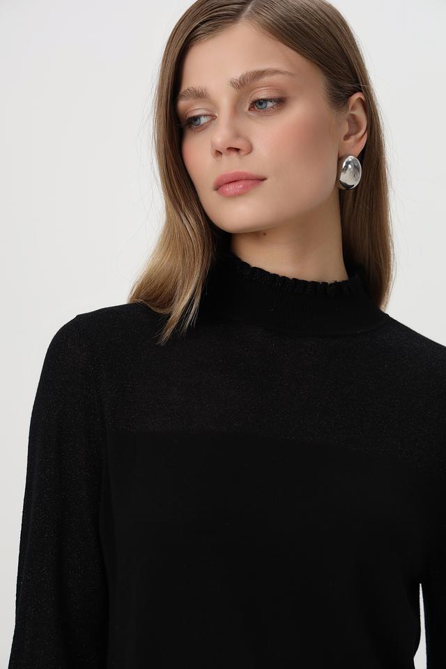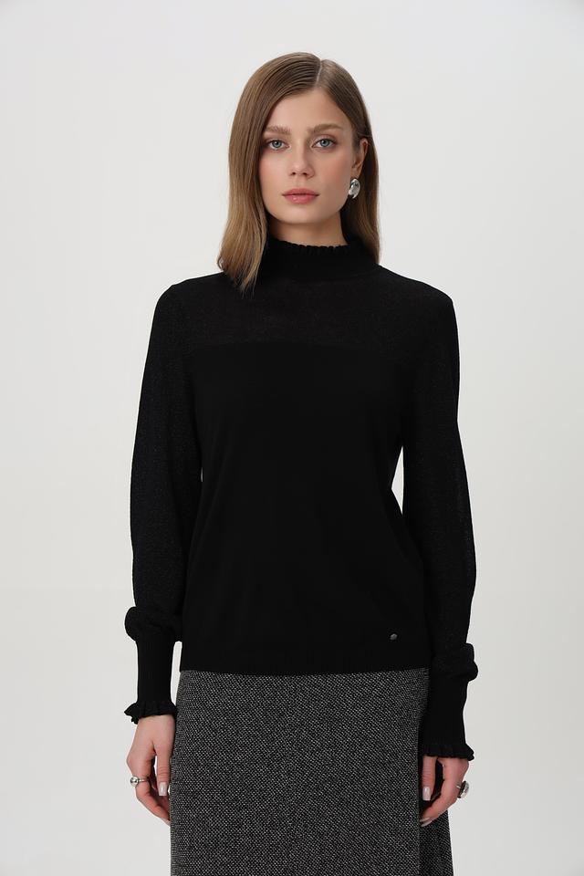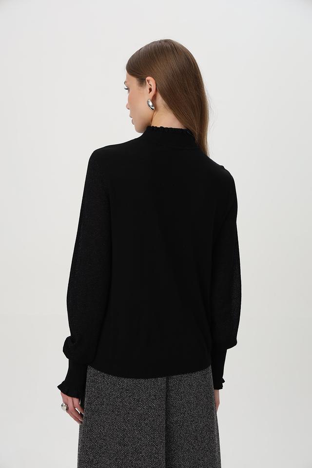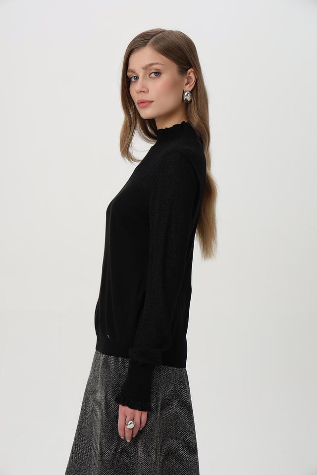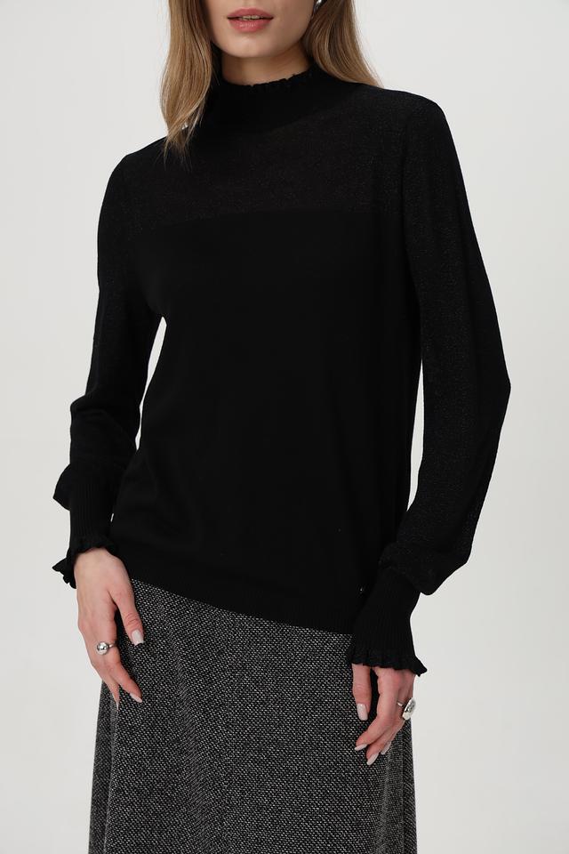Чёрный пуловер от Betty and Co с воротником-стойкой и рукавами с оборками. Изготовлен из мягкого сочетания хлопка, вискозы и полиакрила. Состав: хлопок 40%, полиакрил 32%, вискоза 23%, полиамид 5%
