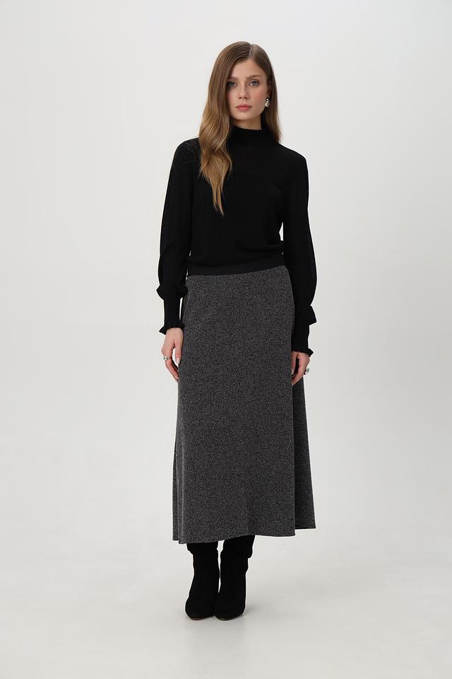 Пуловер имеет классический крой и воротник-стойку, который добавляет образу изысканности. Рукава длинные, с аккуратными оборками на манжетах, что придаёт модели женственности.