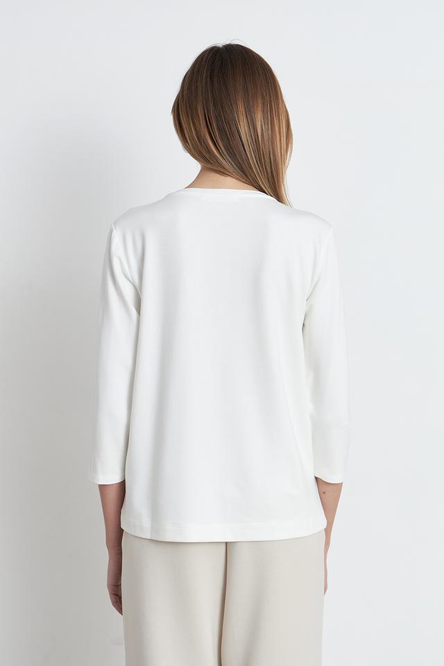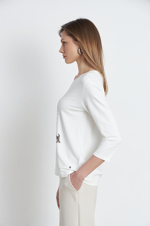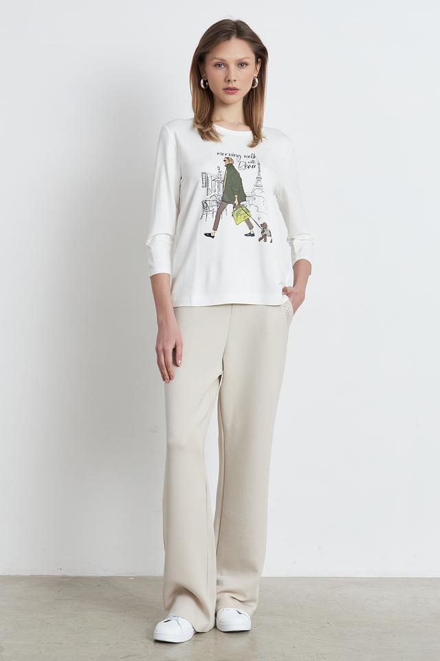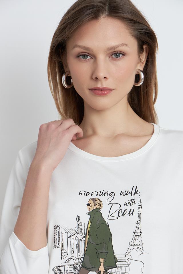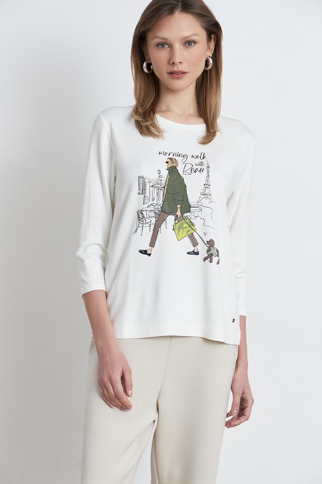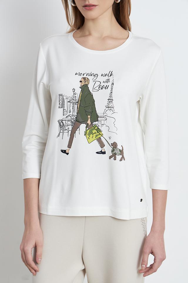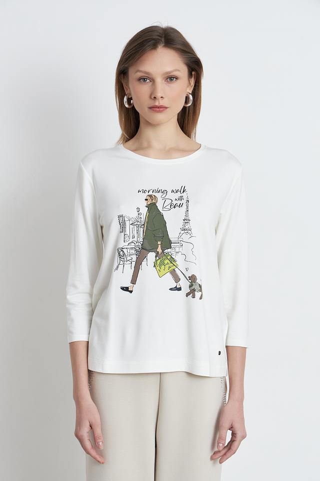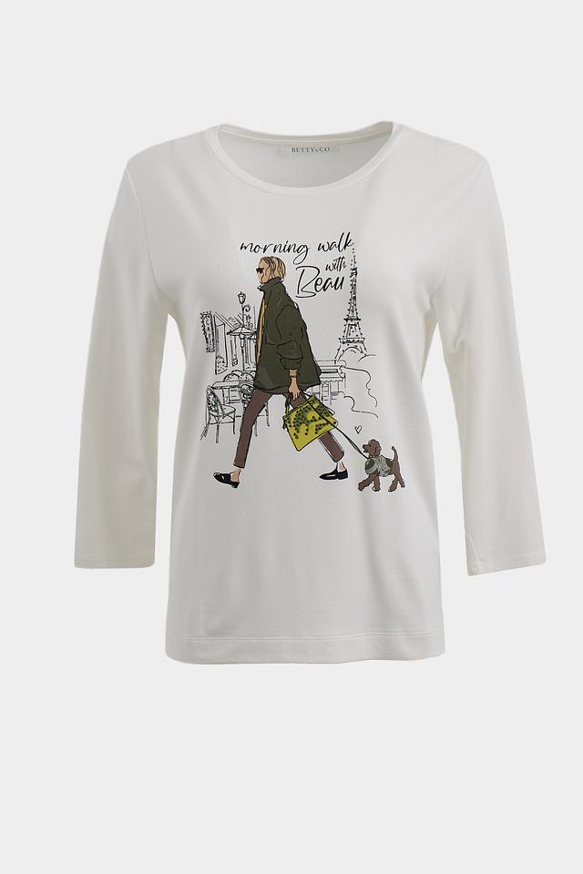 Белая футболка Betty and Co с длинным рукавом и оригинальным принтом в виде городской сцены с девушкой и собакой. Изготовлена из мягкой и приятной к телу вискозы с добавлением модала и эластана. Состав: вискоза 66%, модал 29%, эластан 5%