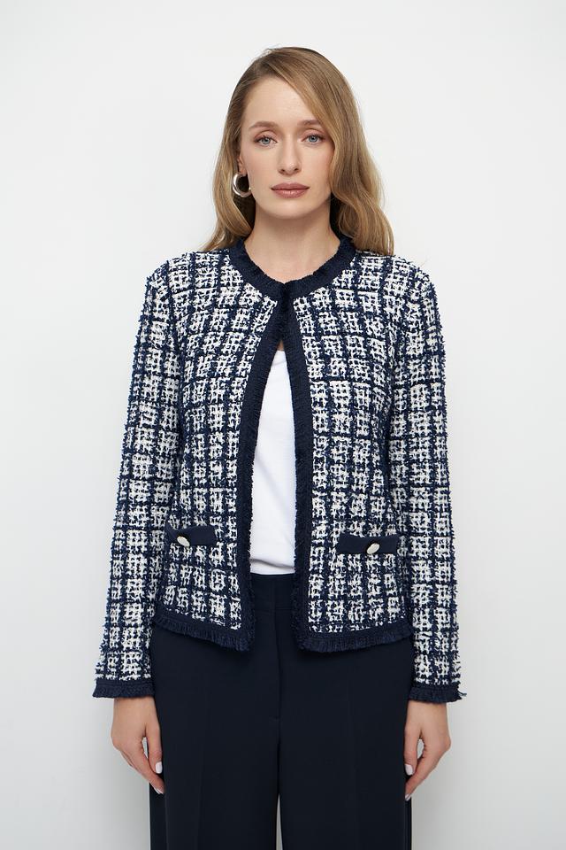 Жакет имеет короткую посадку, что делает его идеальным для создания модных и современных образов. Застежка отсутствует, что позволяет легко надевать и снимать жакет. Отделка по краям выполнена из бахромы в тон основной ткани.