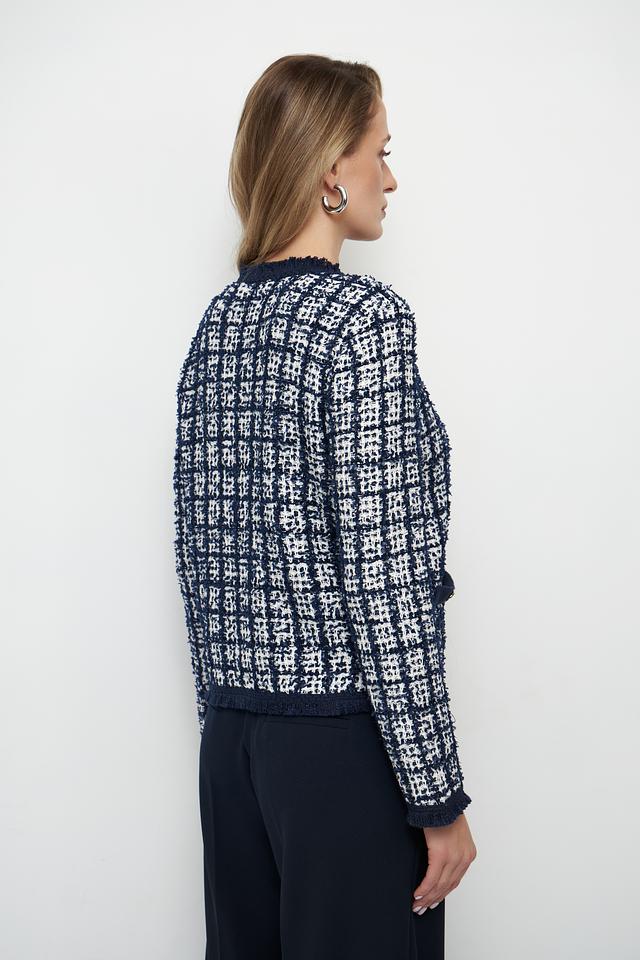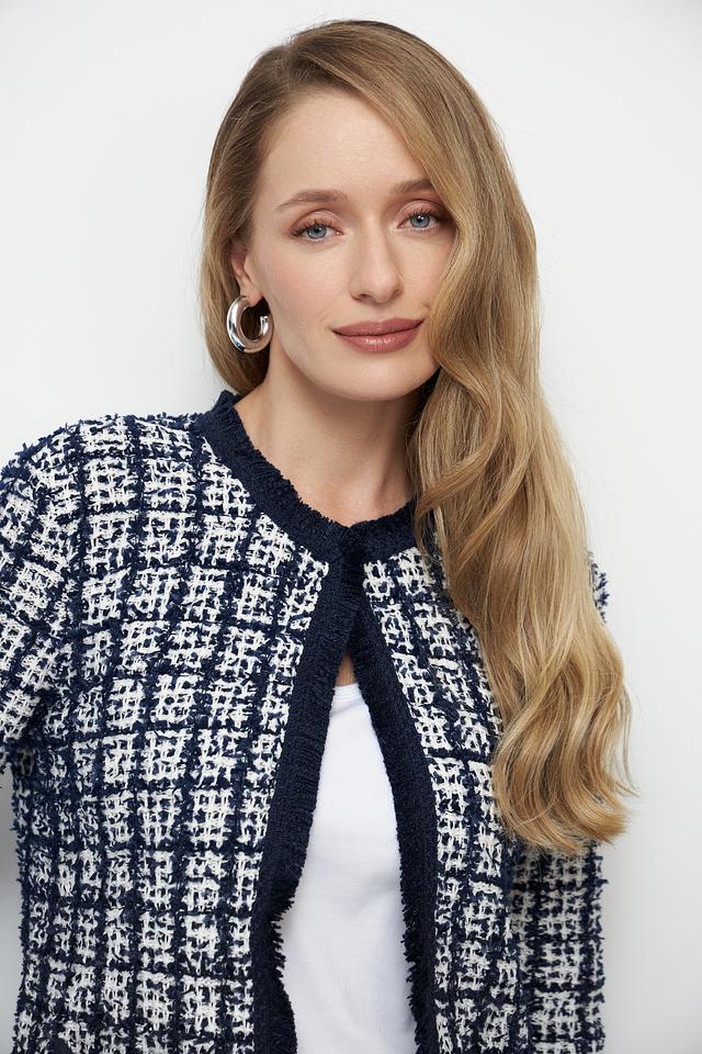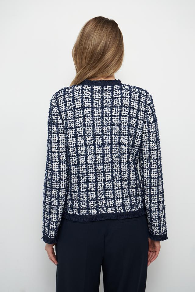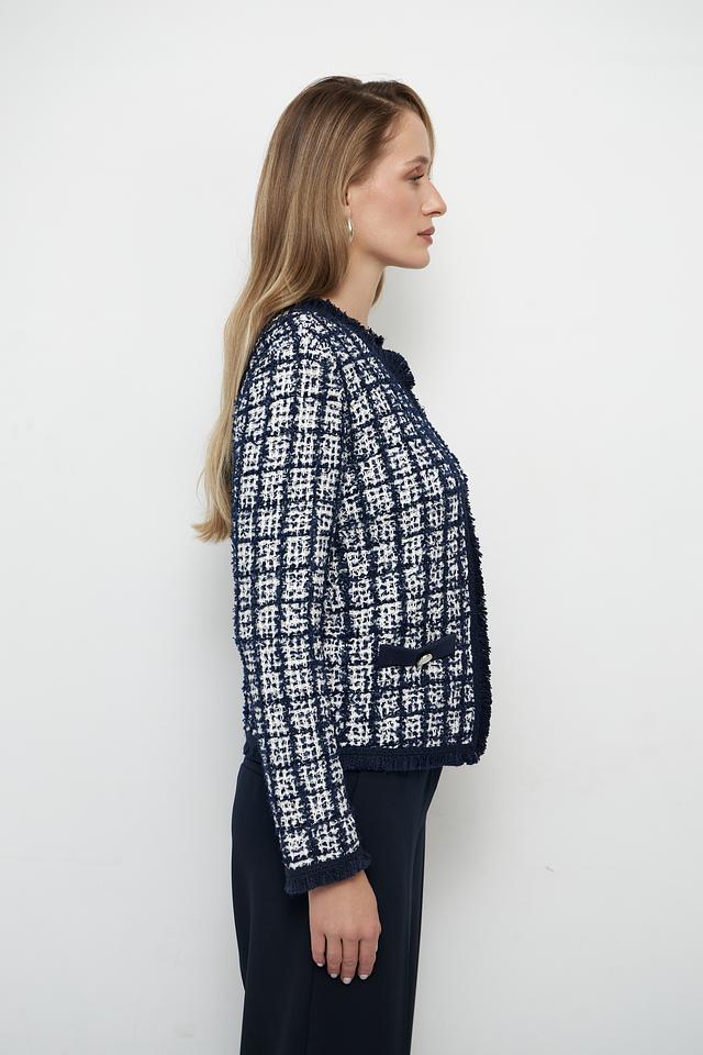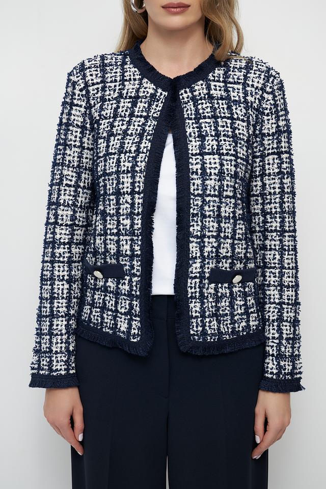 Этот жакет от Betty and Co станет прекрасным дополнением к вашему гардеробу. Модель выполнена в темно-синем цвете с классическим клетчатым узором, который придает ей элегантный и утонченный вид.
