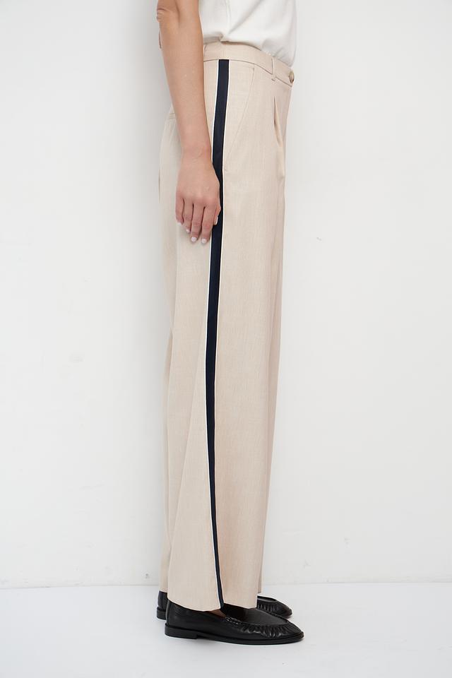 Брюки имеют классическую посадку на талии, пояс дополнен аккуратной пуговицей. Широкие брючины визуально удлиняют силуэт и придают образу лёгкость и воздушность. Наличие боковых карманов обеспечивает дополнительный комфорт.