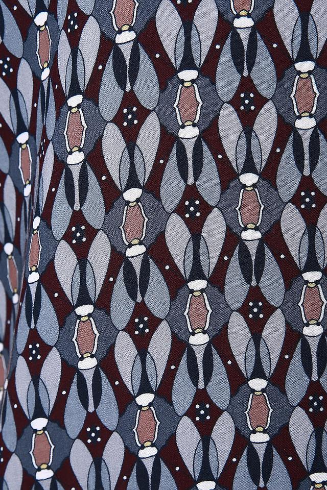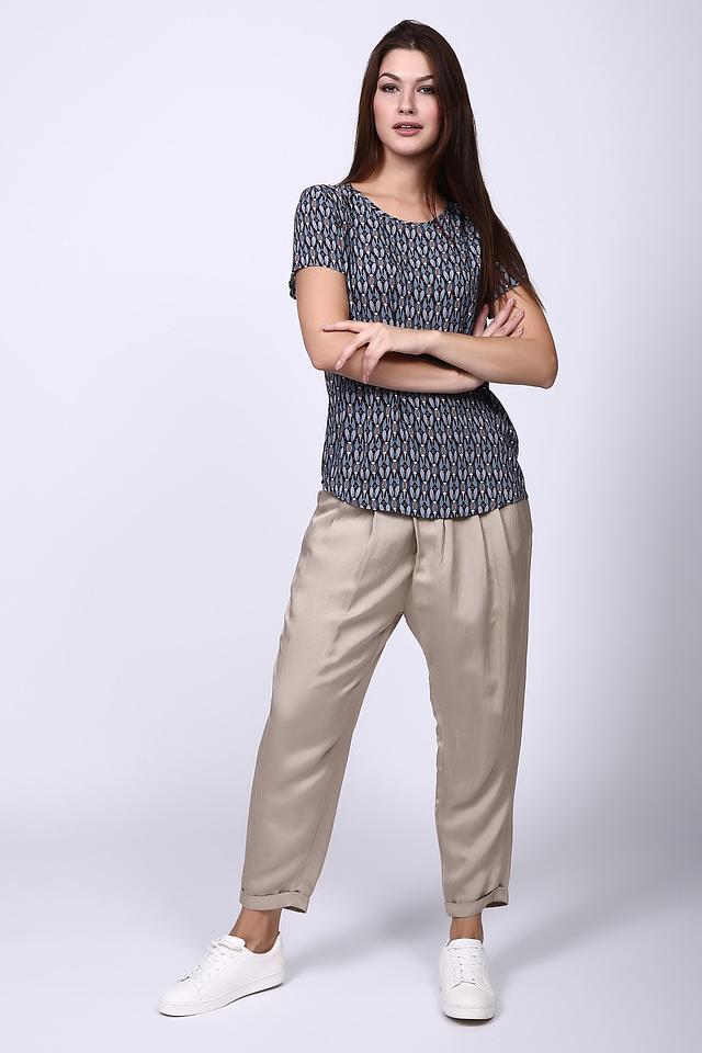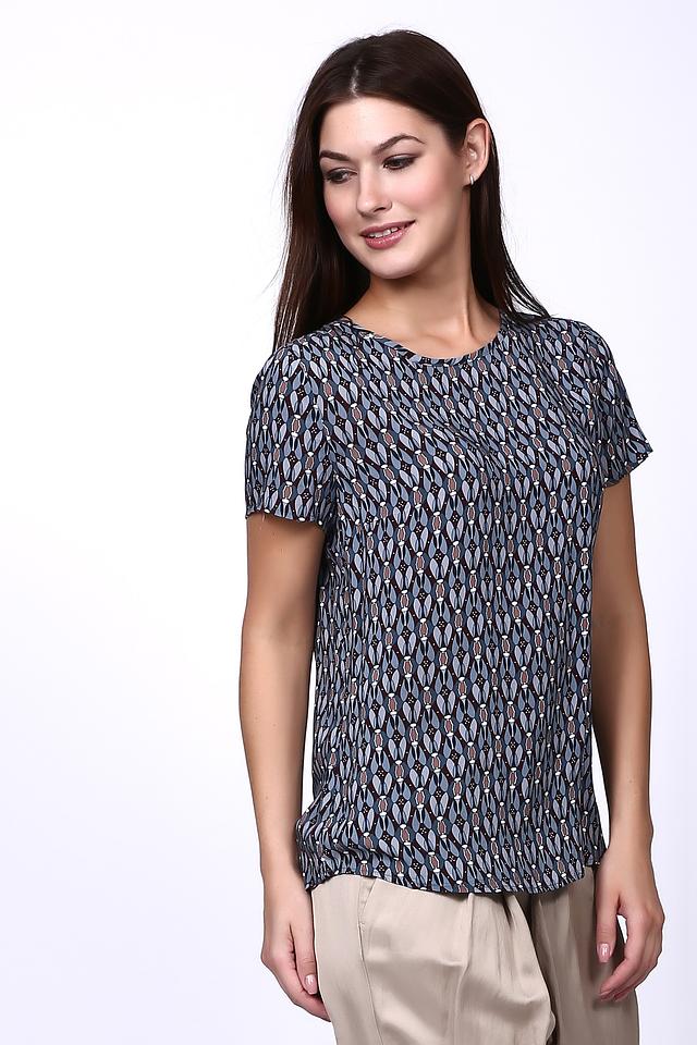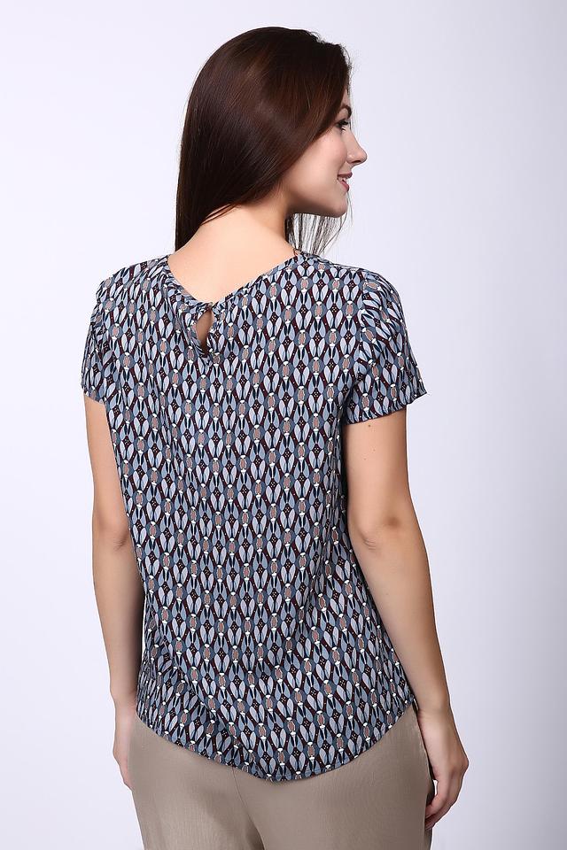 Особенностью данной модели является яркий и оригинальный принт в виде геометрических фигур, выполненный в сочетании синих, коричневых и бежевых оттенков. Вырез горловины округлый, с небольшим вырезом на спине, что придает блузе легкость и женственность.