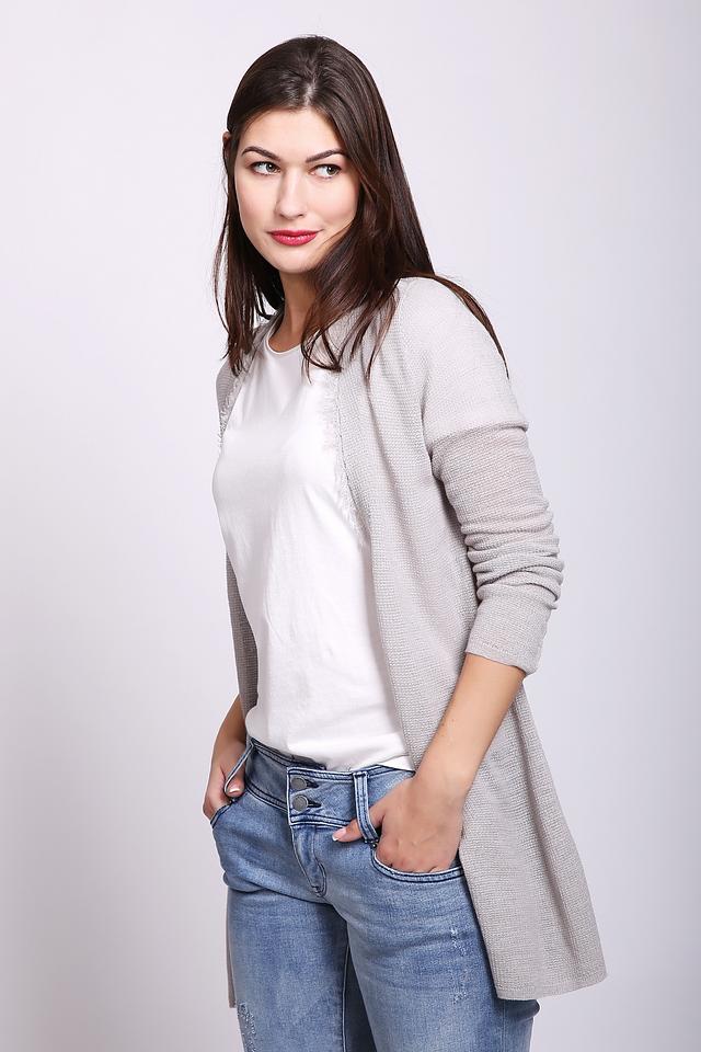 Серый кардиган от Betty and Co – это стильная и удобная модель с длинным рукавом и открытым кроем. Изготовлен из мягкого трикотажа с добавлением льна, что делает его приятным к телу и подходящим для прохладной погоды. Состав: полиакрил 80%, лен 20%