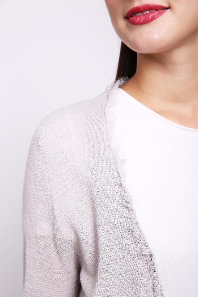 Модель имеет длинные рукава и открытую конструкцию, что позволяет носить его поверх различных видов одежды. Декоративная бахрома по краям придает кардигану особый шарм и оригинальность.