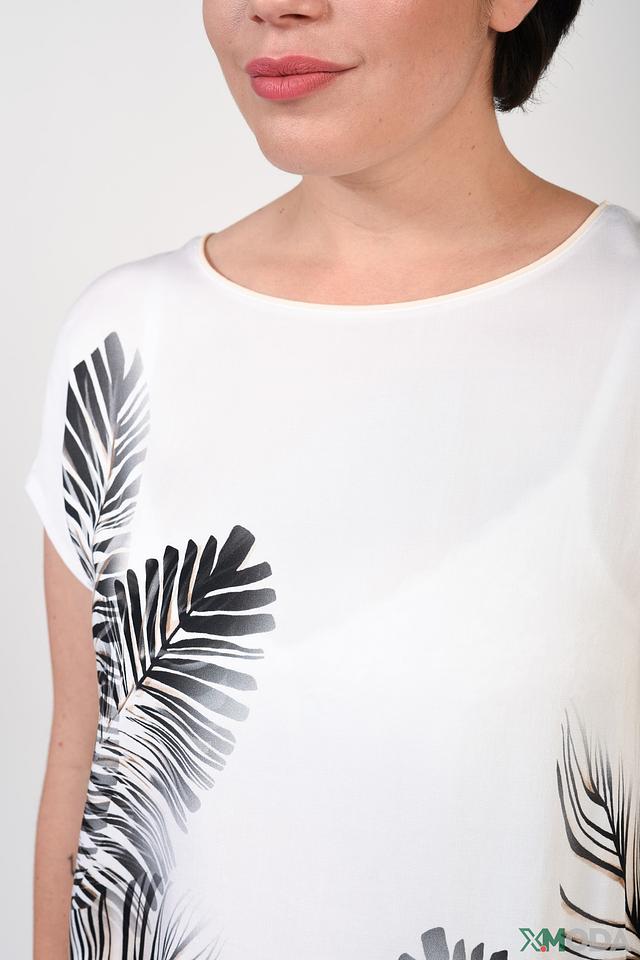 Эта стильная блуза от Betty and Co выполнена в белом цвете и украшена эффектным принтом с изображением тропических листьев чёрного цвета. Блуза имеет свободный крой, короткие рукава и округлый вырез горловины, что делает её универсальной и подходящей для различных случаев.