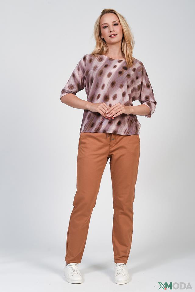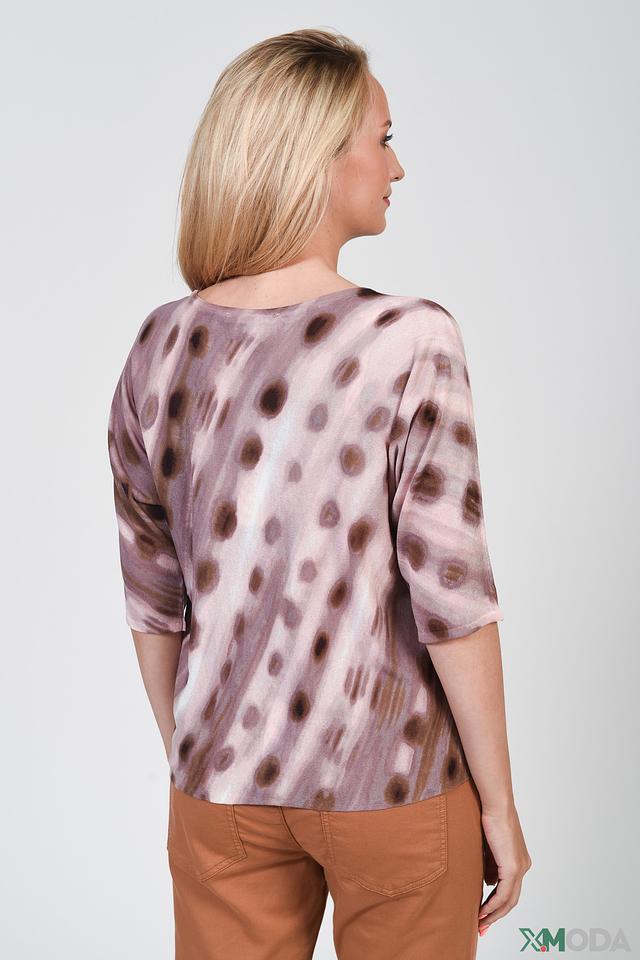 Этот женский пуловер от Betty and Co выполнен в нежно-лиловом цвете и украшен стильным принтом в виде коричневых горошин. Модель имеет округлый вырез горловины и короткие рукава, что делает ее идеальным выбором для теплой погоды.