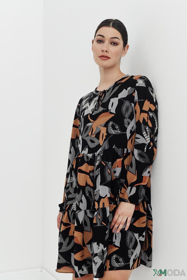 Модель имеет длину до колена, длинные рукава и круглый вырез горловины. Платье слегка приталено в области груди и плавно расширяется к низу, создавая женственный силуэт. Застёжки и молнии отсутствуют, что обеспечивает комфорт при носке.