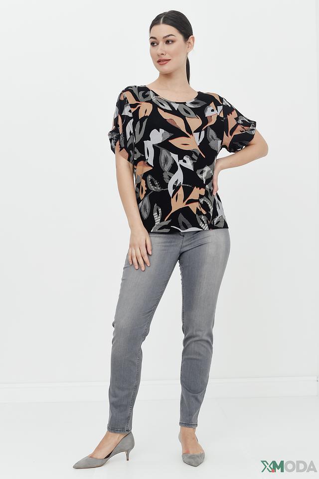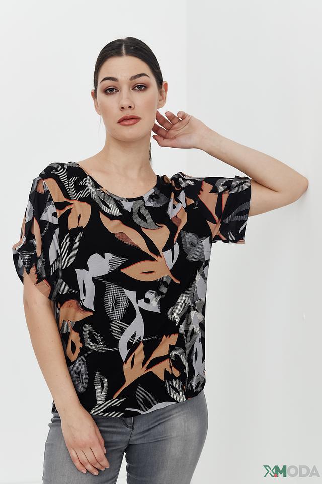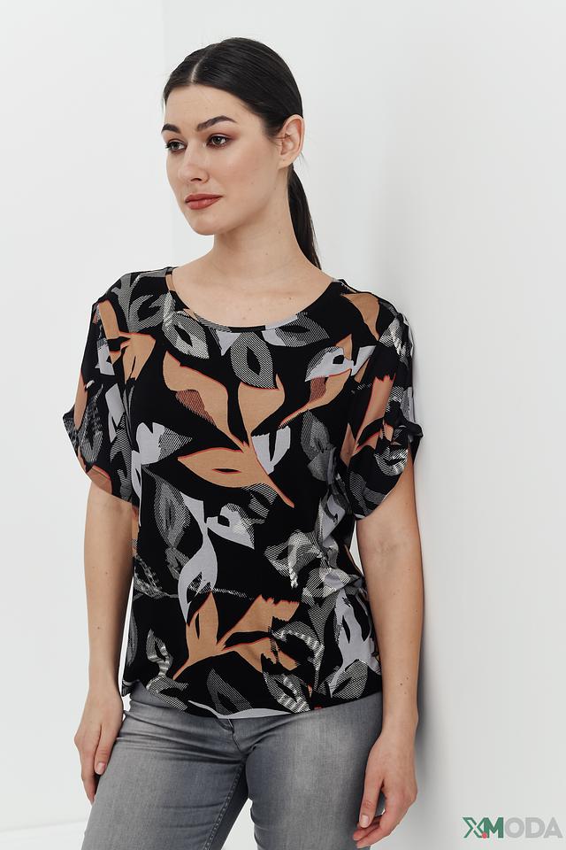 Основной цвет блузы – чёрный, который служит прекрасным фоном для яркого и необычного цветочного принта, выполненного в оттенках серого, бежевого и коричневого. Принт добавляет блузе оригинальности и делает её запоминающейся.