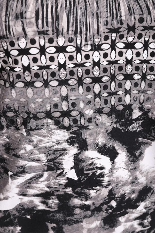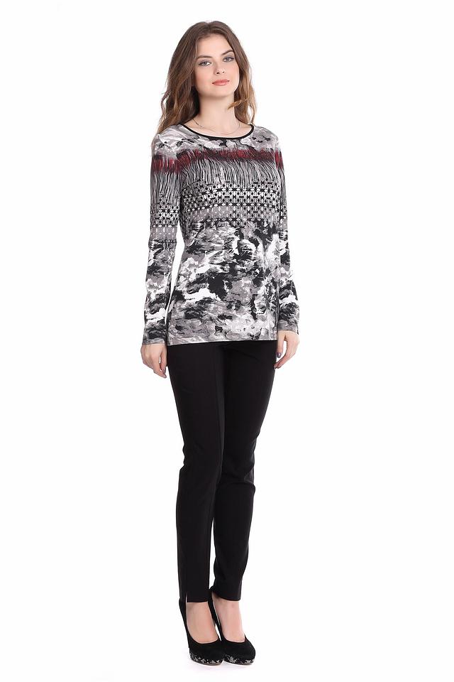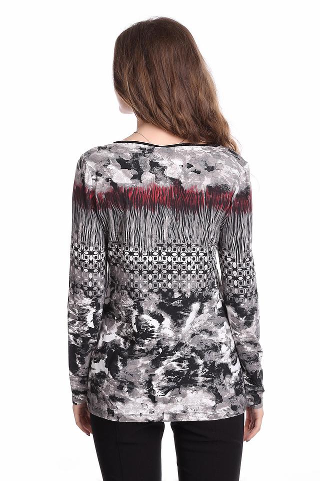 Основной цвет блузы – серый, но она украшена ярким и необычным принтом, сочетающим в себе элементы абстракции и геометрических узоров. Принт выполнен в оттенках серого, черного и бордового, что придает блузе особую выразительность.