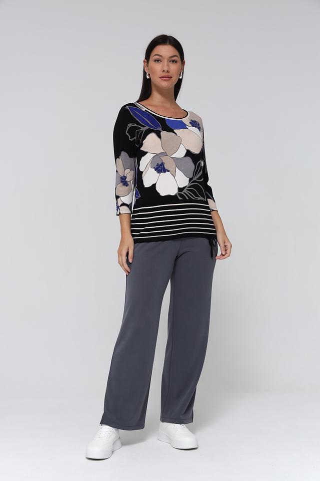 Этот стильный пуловер от Betty Barclay выполнен в чёрном цвете и украшен эффектным цветочным принтом, состоящим из оттенков синего, бежевого и серого. Модель имеет округлый вырез горловины и рукава длиной три четверти, что делает её универсальной для различных образов.