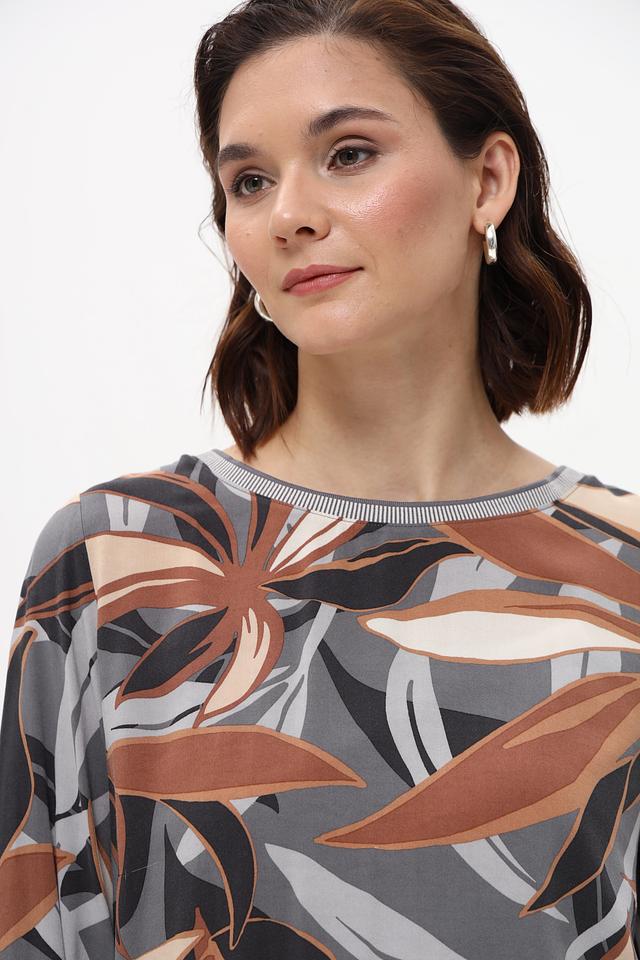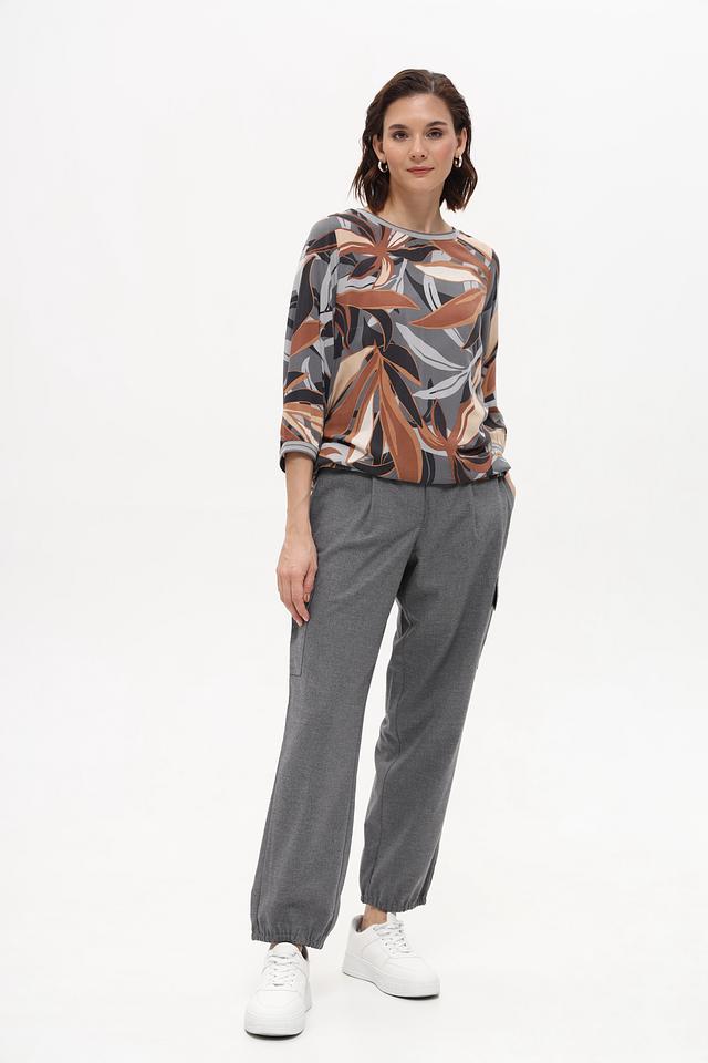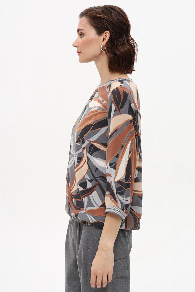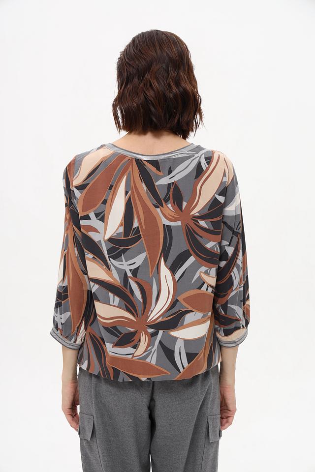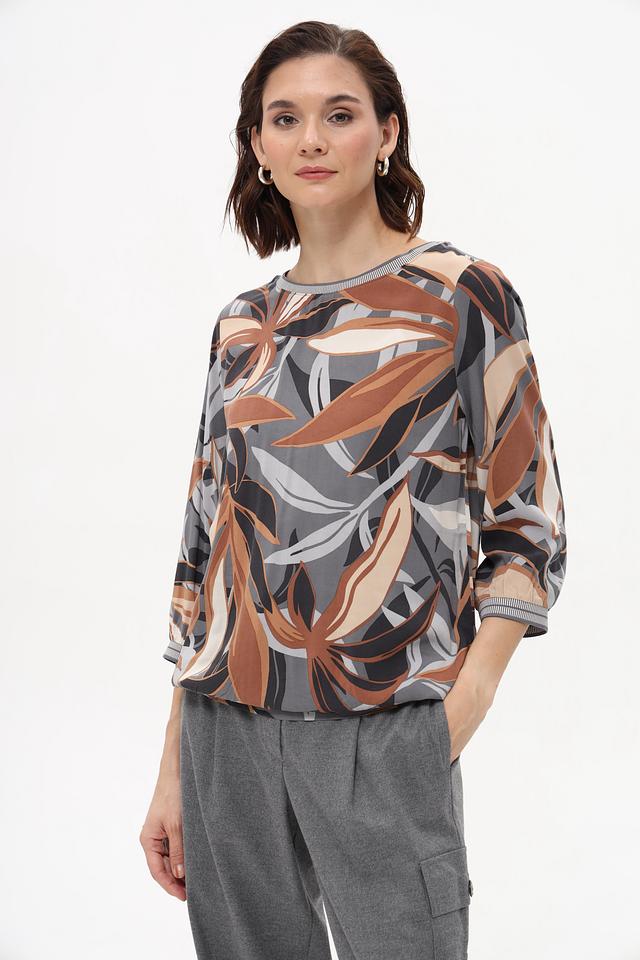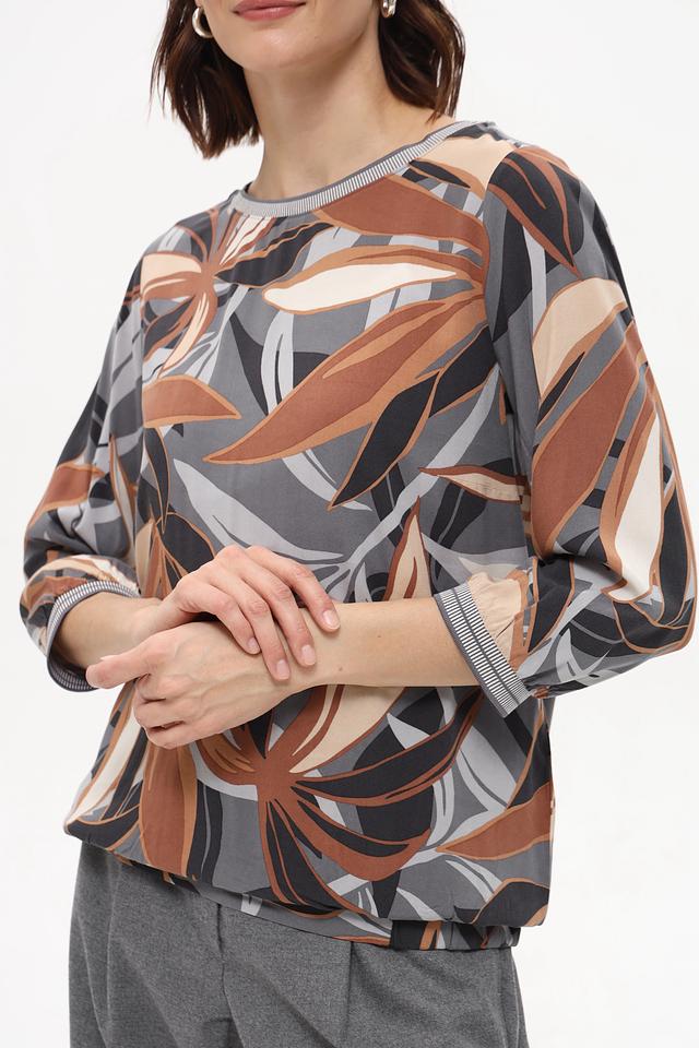 Особенностью данной модели является яркий и оригинальный принт в виде листьев, выполненный в коричневой, серой и бежевой цветовой гамме. Блуза имеет округлый вырез горловины и короткие рукава, что делает ее идеальным выбором для теплой погоды.
