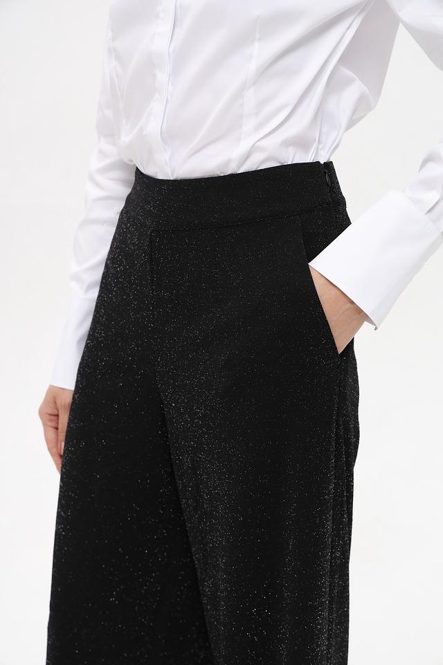 Модель имеет прямой крой, который подчеркивает фигуру, не сковывая движений. Высокая посадка визуально удлиняет ноги и делает силуэт более стройным. Брюки изготовлены из мягкой и приятной к телу ткани, в составе которой преобладает полиэстер, дополненный эластаном и полиамидом для обеспечения комфорта и хорошей посадки.