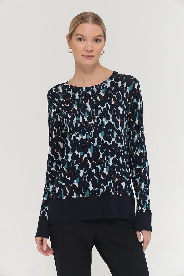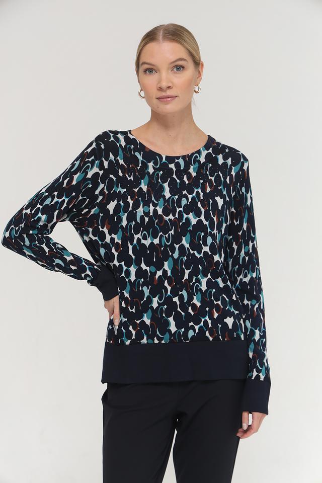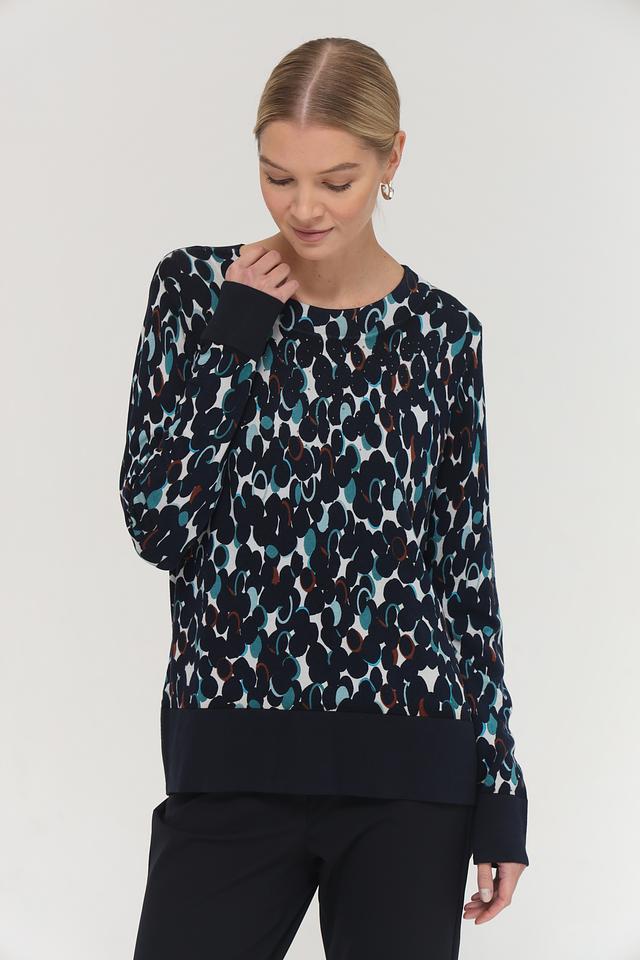 Особенностью модели является двухслойный дизайн: верхняя часть выполнена из легкой, полупрозрачной ткани с принтом, а нижняя – из плотной ткани однотонного темно-синего цвета. Рукава и нижняя кромка также выполнены из плотной ткани, что придает пуловеру аккуратный и завершенный вид.