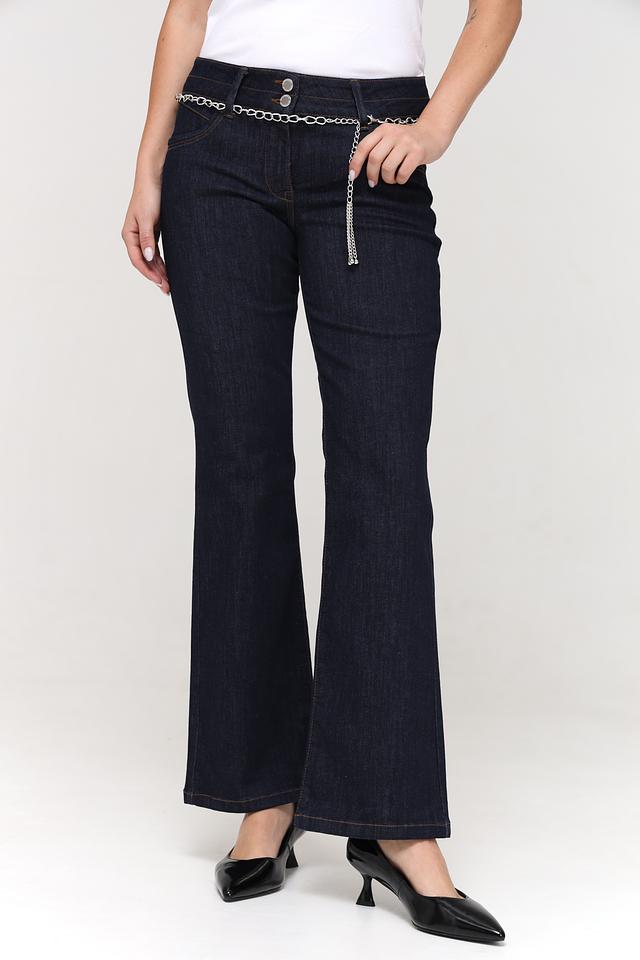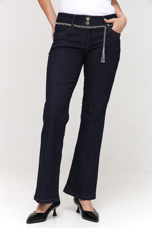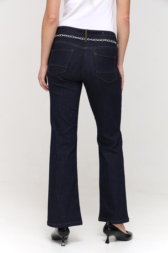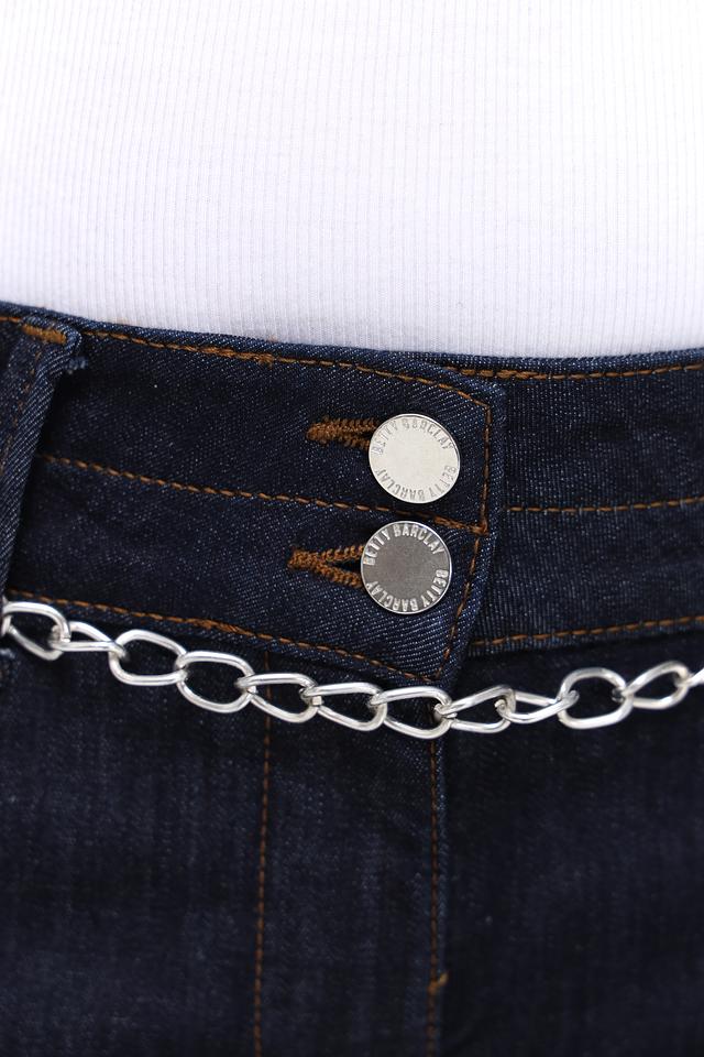 Джинсы клеш от Betty Barclay тёмно-синего цвета с декоративной цепочкой на поясе. Модель выполнена из качественного хлопка с добавлением полиэстера и эластана для комфорта и лучшей посадки. Состав: хлопок 84%, полиэстер 13%, эластан 3%