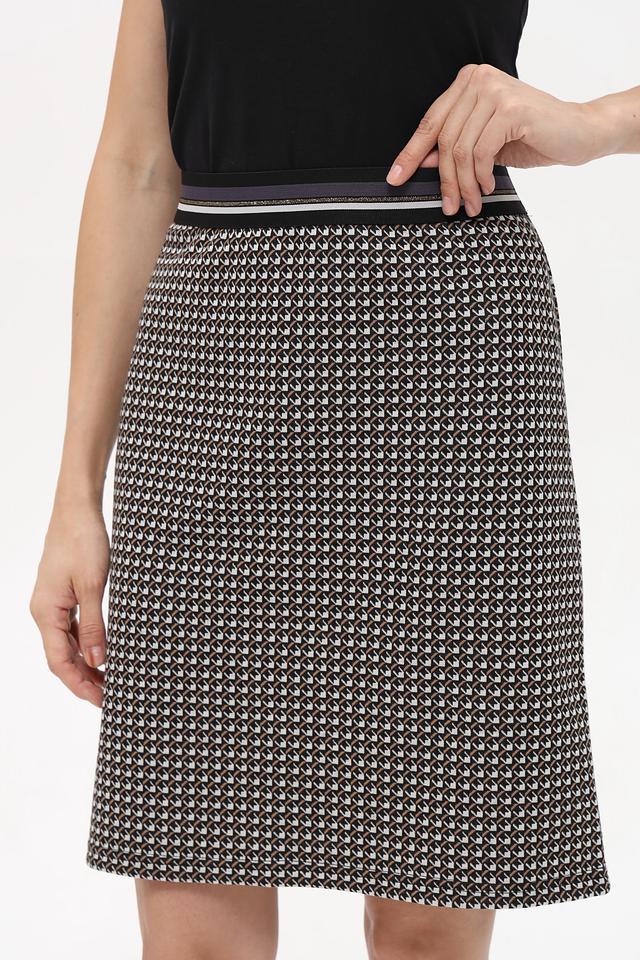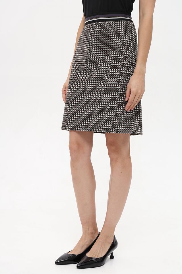 Юбка имеет классическую прямую форму и длину до колена. Особенностью модели является стильный геометрический принт в чёрно-белой гамме, который придаёт ей элегантный и современный вид. Эластичный пояс обеспечивает комфортную посадку по фигуре.