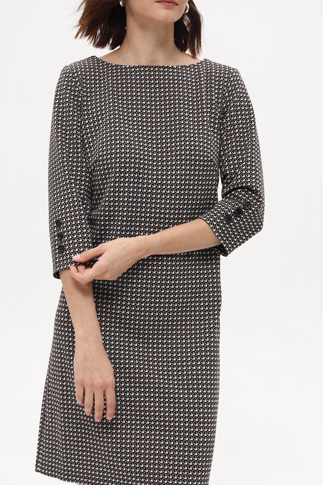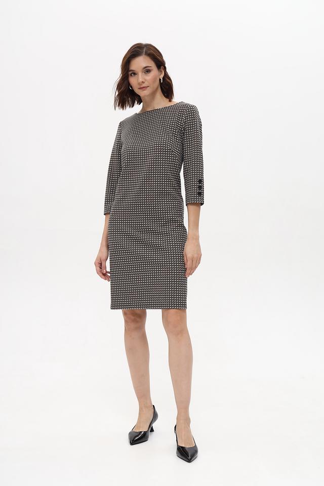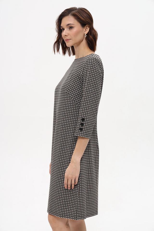 Модель имеет прямой силуэт и длину до колена, что делает его подходящим для различных случаев – от деловых встреч до повседневной носки. Круглый вырез горловины и короткие рукава с декоративными пуговицами добавляют образу изысканности.