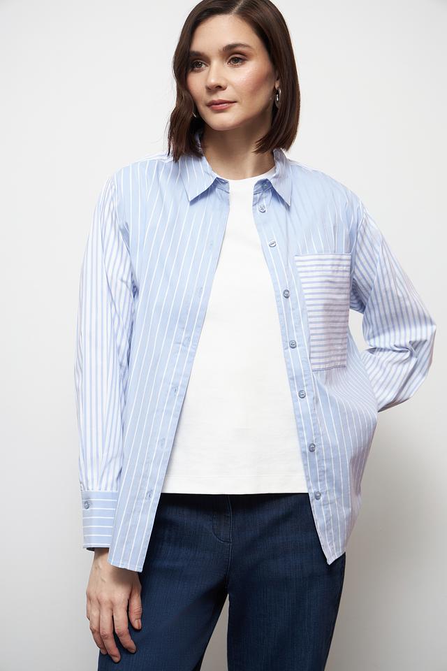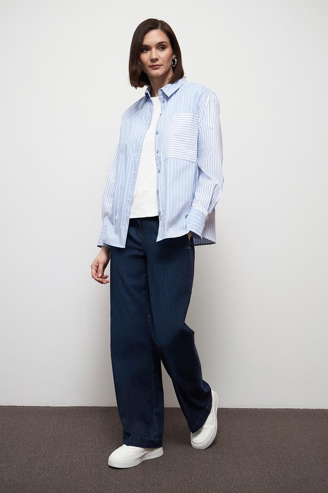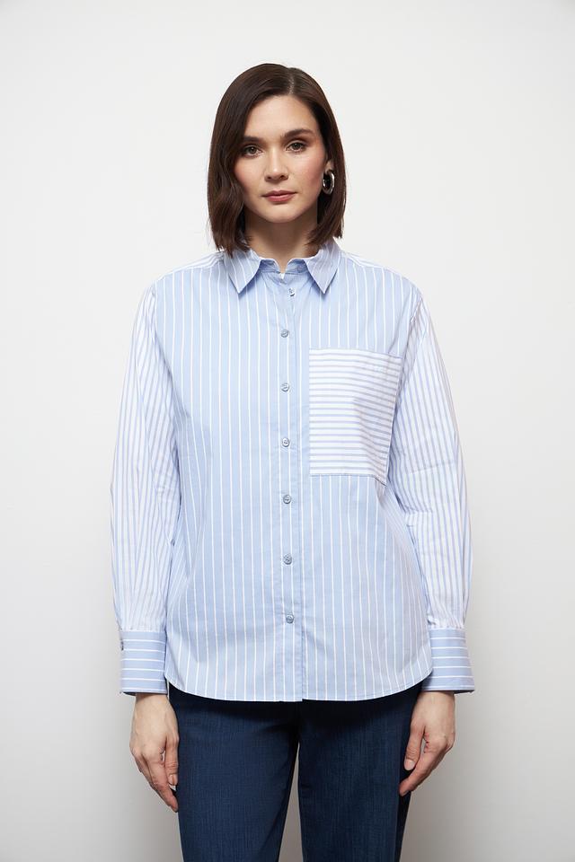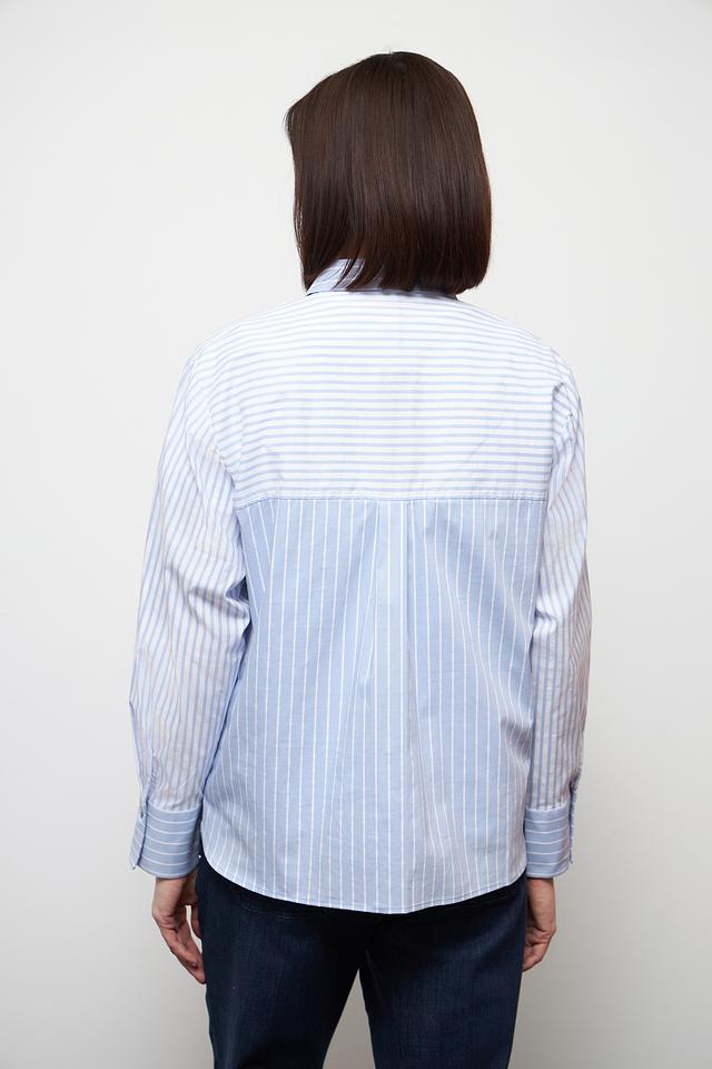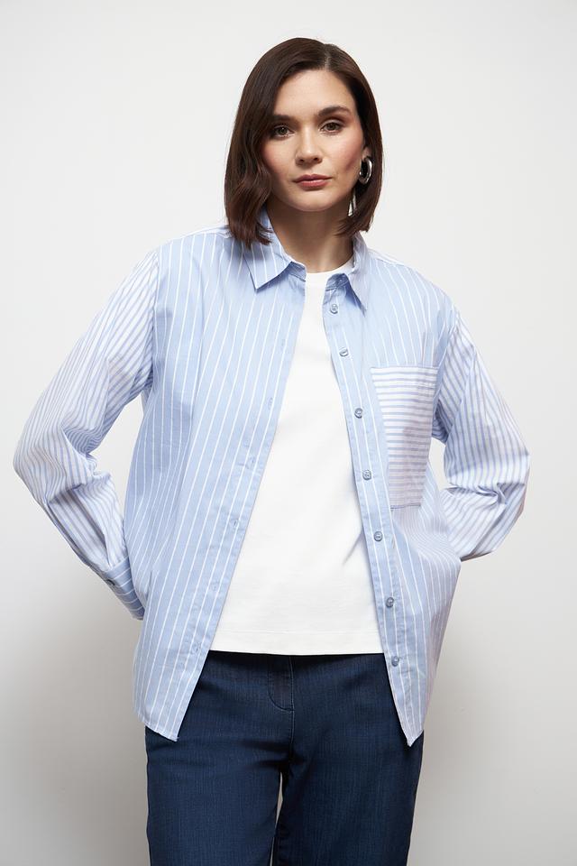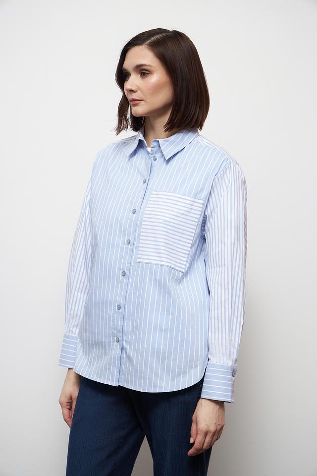 Рубашка имеет классический крой с длинными рукавами и отложным воротником. Особенностью модели является сочетание голубой полоски и белого фона, а также контрастный нагрудный карман в полоску. Застежка на пуговицы по всей длине.