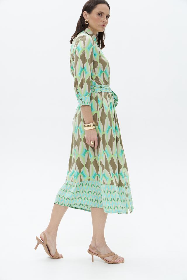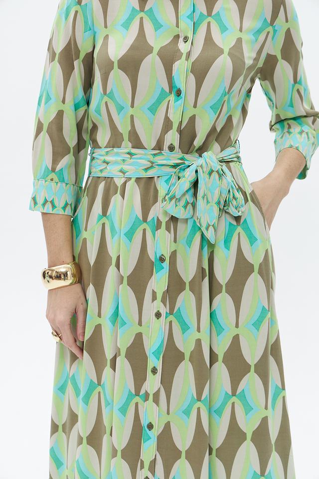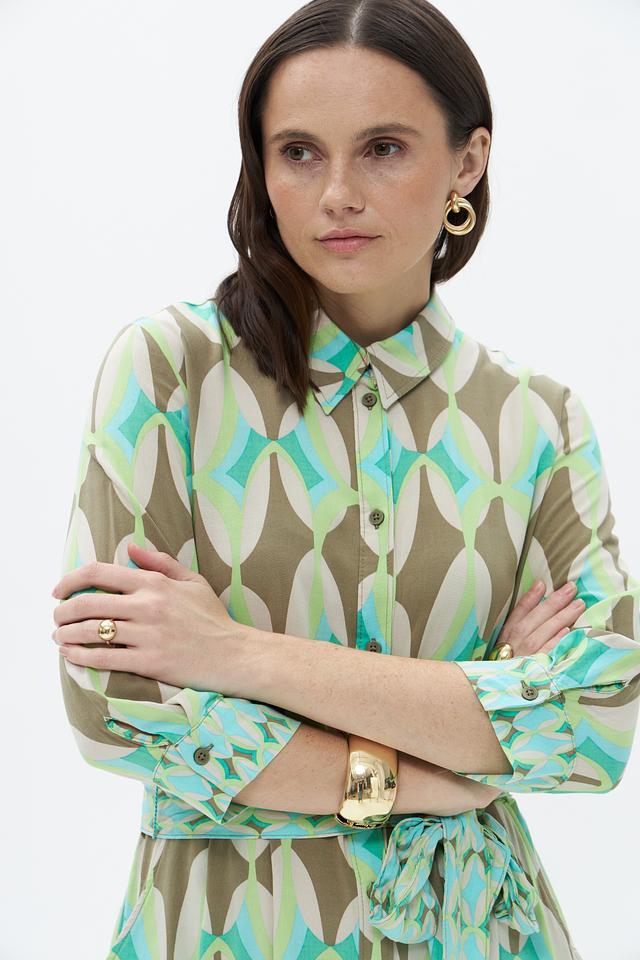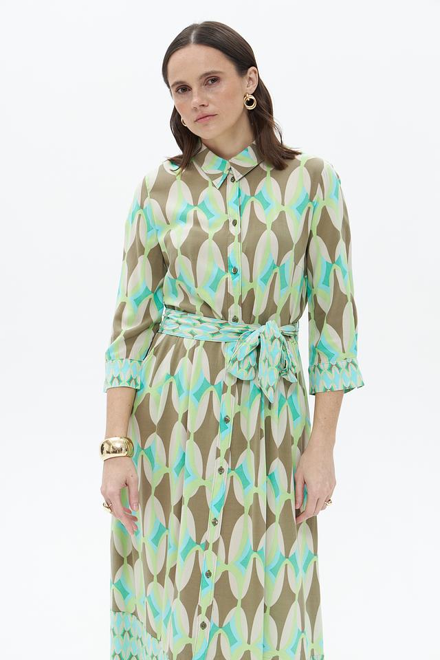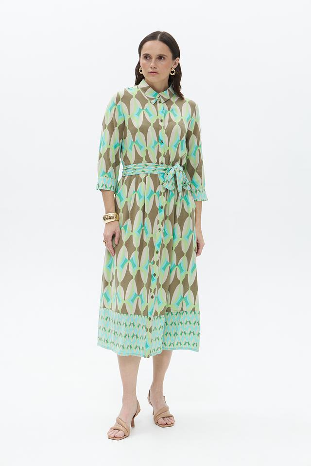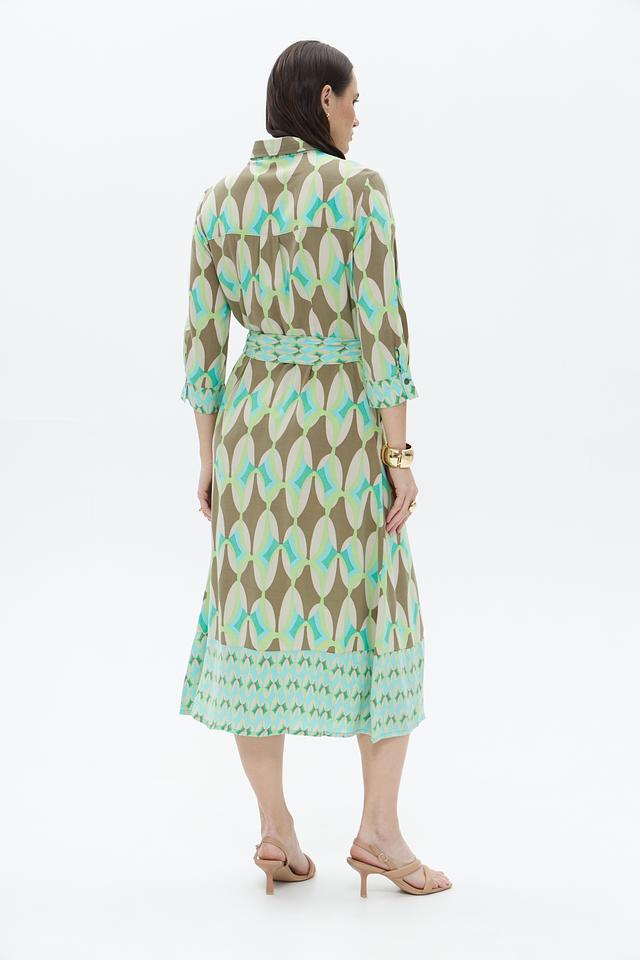 Платье Betty Barclay зеленого цвета с оригинальным геометрическим принтом. Модель выполнена из 100% вискозы, имеет рубашечный крой, застежку на пуговицы и пояс. Состав: вискоза 100%