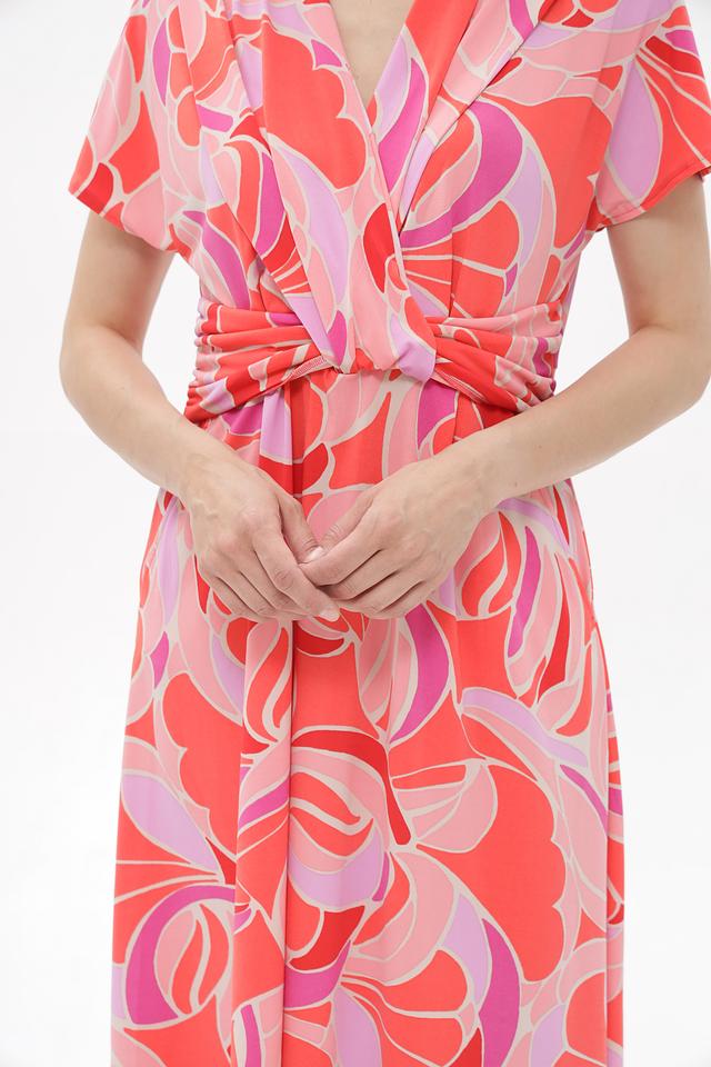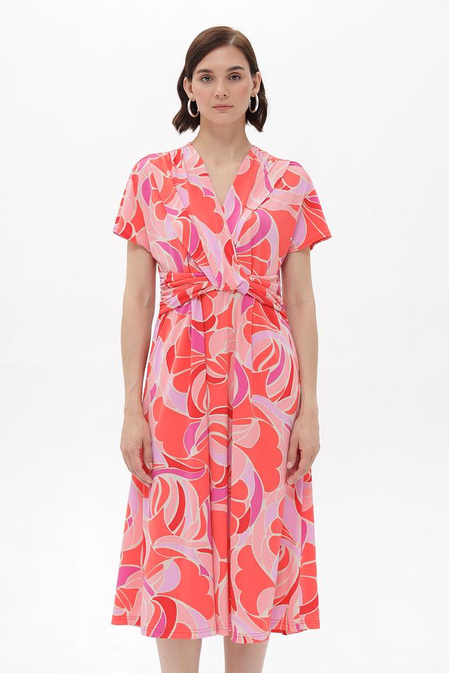 Платье имеет короткие рукава и V-образный вырез, который визуально удлиняет шею. Талия подчеркнута оригинальной скруткой, создающей женственный силуэт. Яркий цветочный принт добавляет образу легкости и свежести.