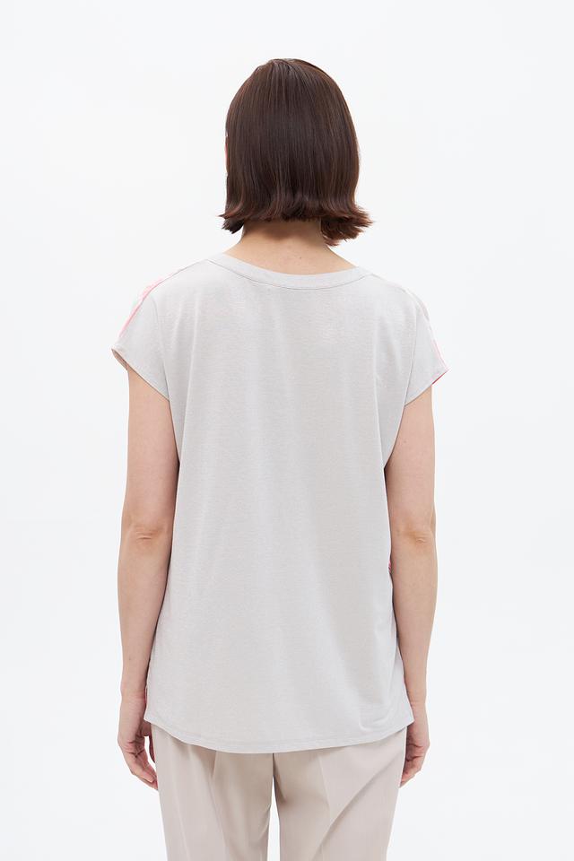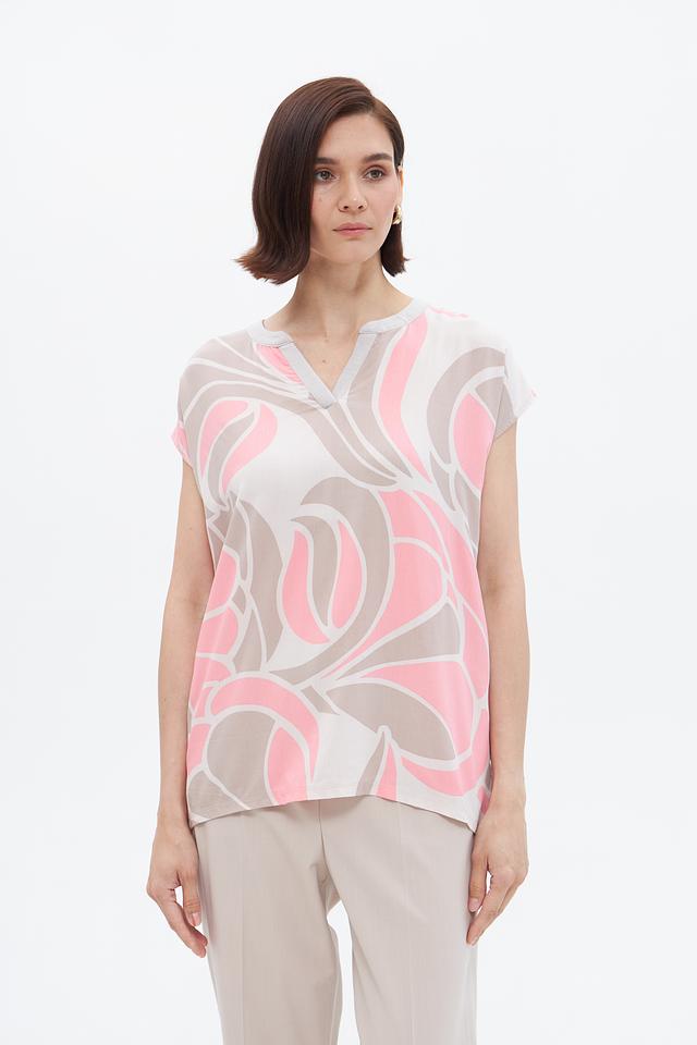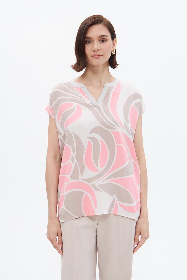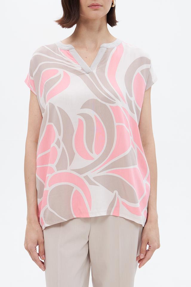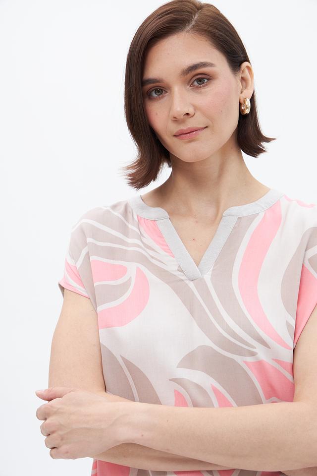 Модель имеет свободный крой, который не сковывает движений и обеспечивает максимальный комфорт в течение дня. V-образный вырез горловины и короткие рукава делают блузу идеальной для теплой погоды.