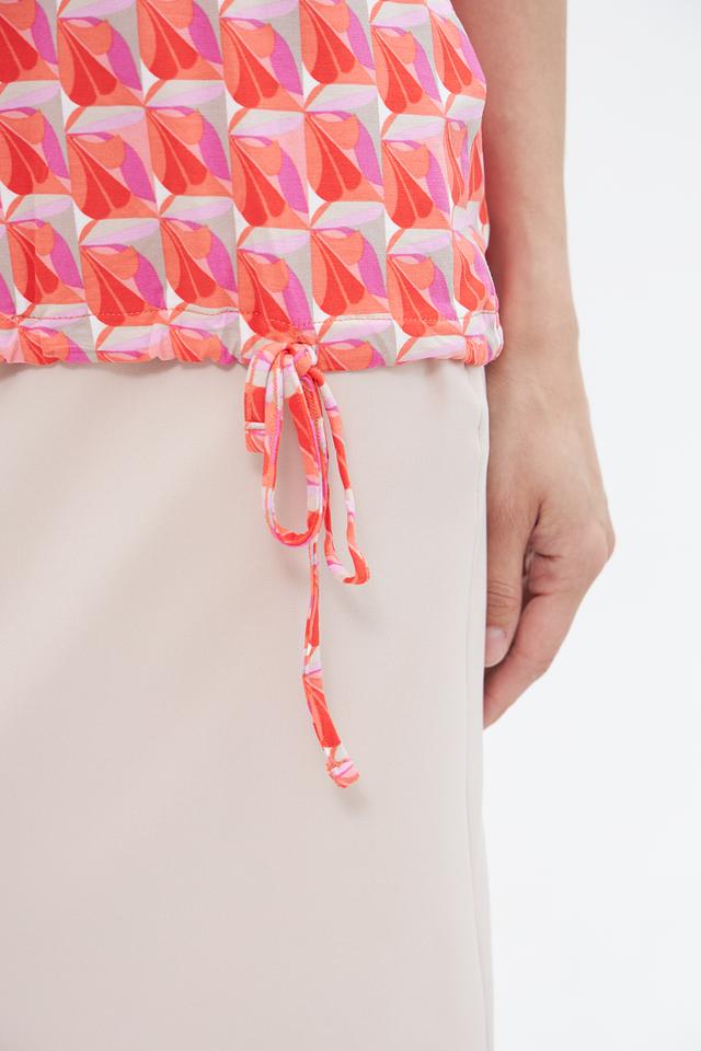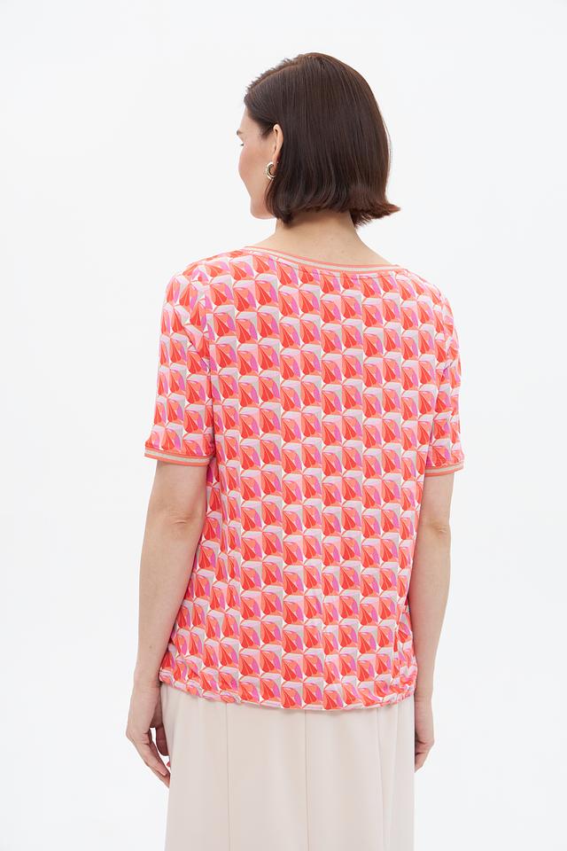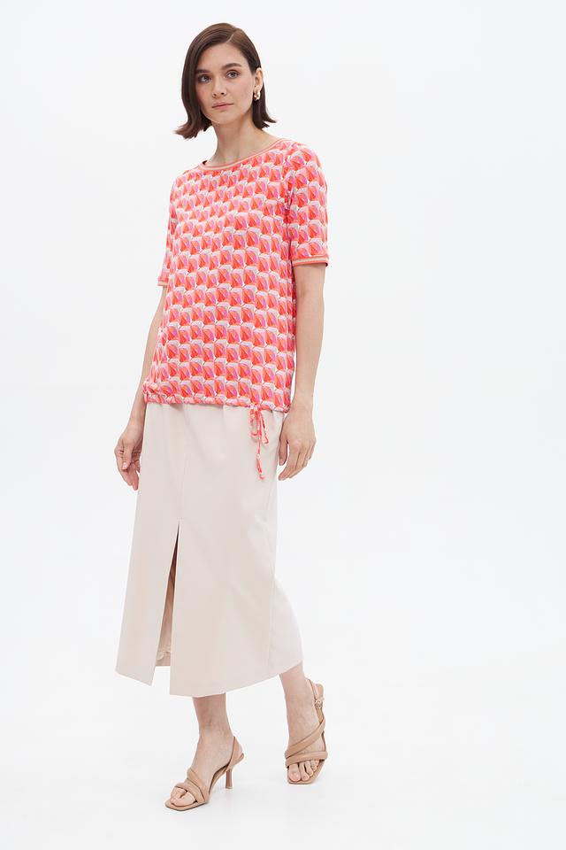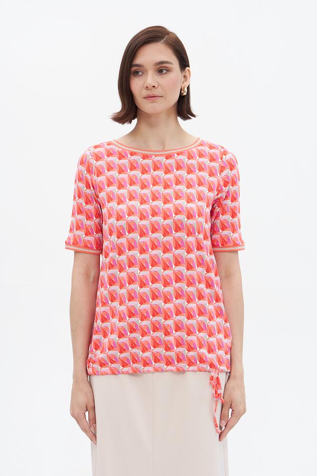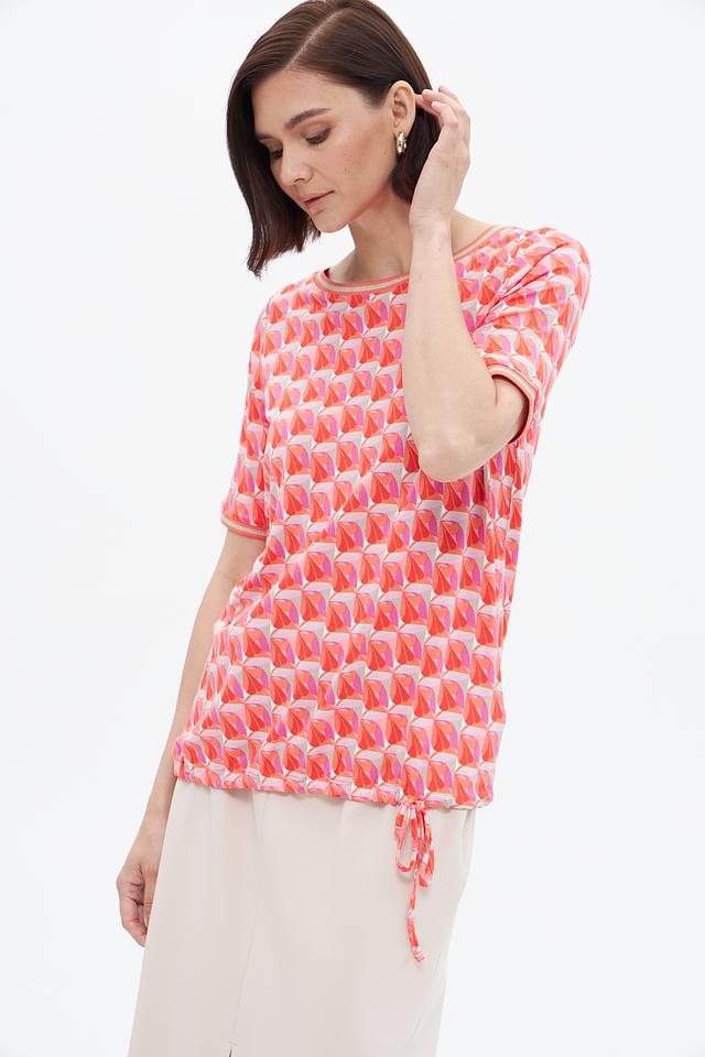 Блузка Betty Barclay кораллового цвета с геометрическим принтом – стильное и удобное решение для создания повседневного образа. Выполнена из мягкой вискозы с добавлением эластана, обеспечивающего комфортную посадку. Модель дополнена кулиской по бокам. Состав: вискоза 95%, эластан 5%