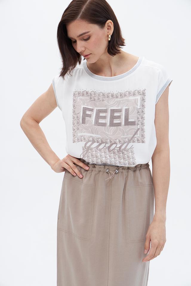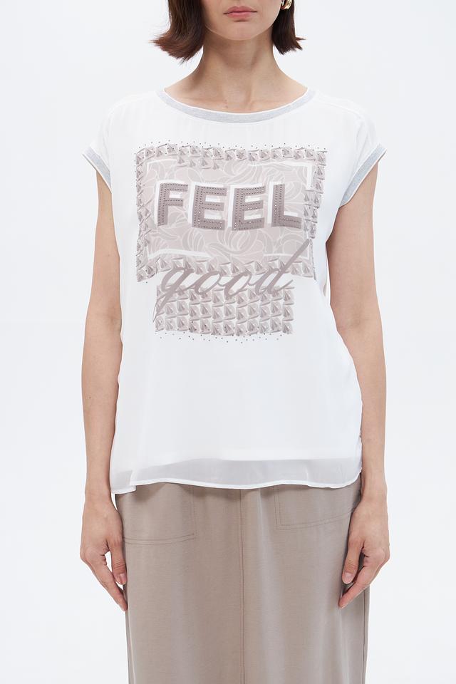 Белая блузка Betty Barclay с оригинальным принтом "FEEL good" станет стильным дополнением к вашему гардеробу. Модель свободного кроя с короткими рукавами выполнена из лёгкой вискозы с добавлением эластана. Состав: вискоза 95%, эластан 5%