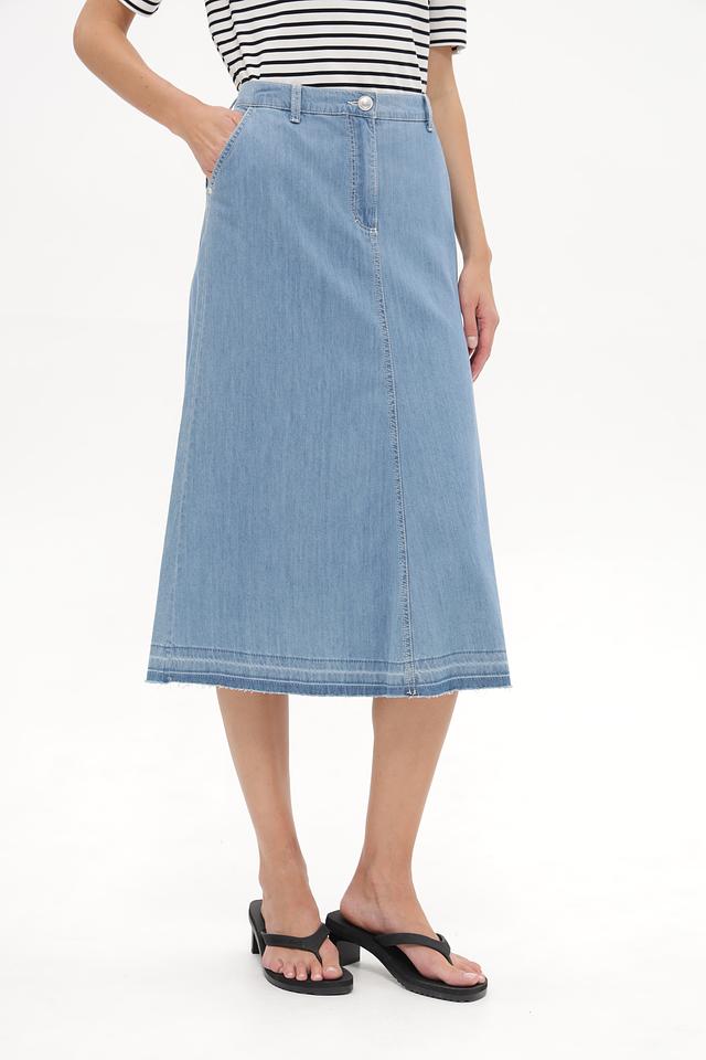 Модель имеет длину миди и прямой крой, обеспечивающий комфортную посадку. Наличие боковых карманов добавляет практичности. Слегка необработанный край придает юбке современный и расслабленный вид.