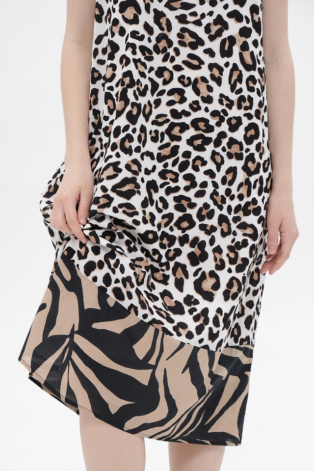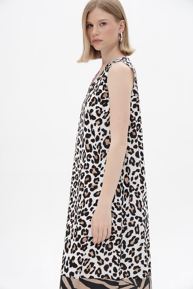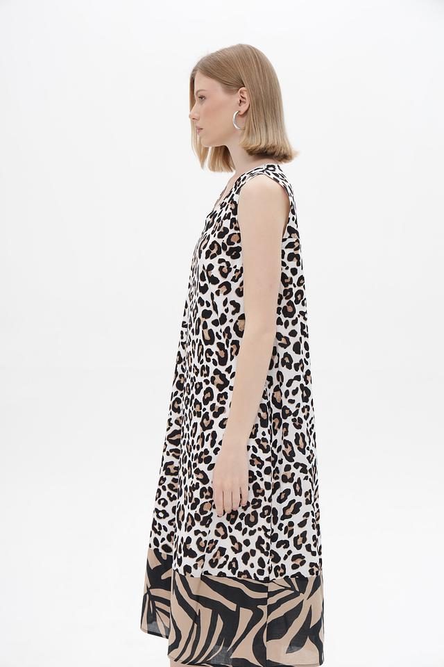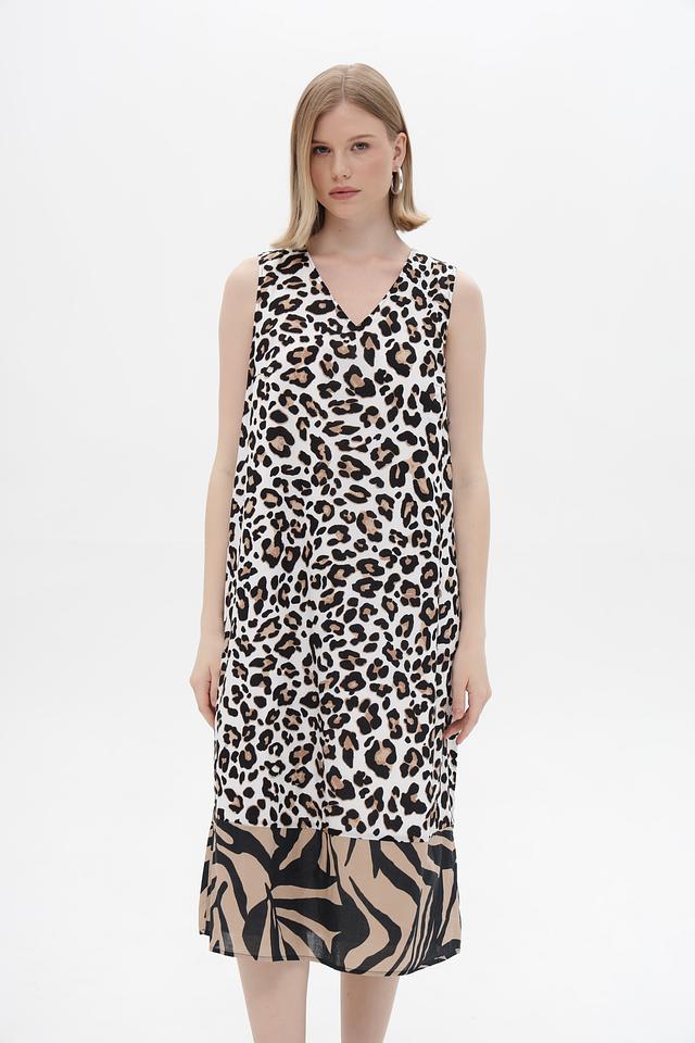 Верхняя часть платья выполнена в бежевом цвете с классическим леопардовым принтом. Нижняя часть платья декорирована принтом в полоску, сочетающим в себе бежевый и чёрный цвета. V-образный вырез горловины подчеркивает женственность образа. Бретели платья узкие и не регулируются.