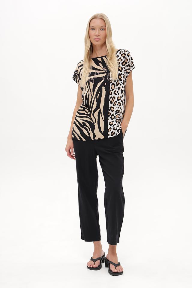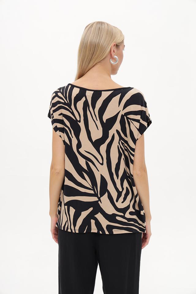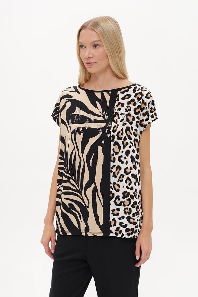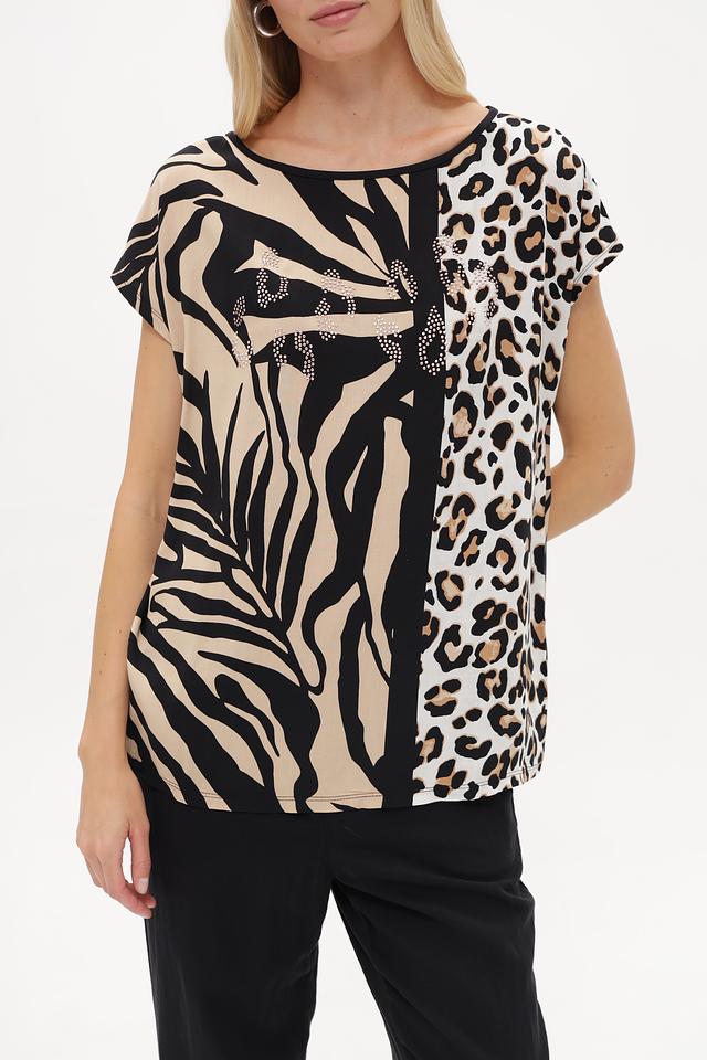 Блузка имеет свободный крой и короткие рукава, что делает ее идеальным выбором для теплой погоды. Особенностью модели является оригинальный принт, сочетающий в себе элементы зебры и леопарда, выполненный в бежевых и черных тонах.