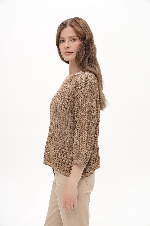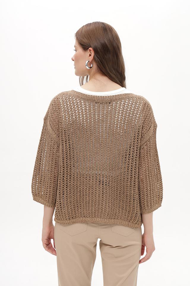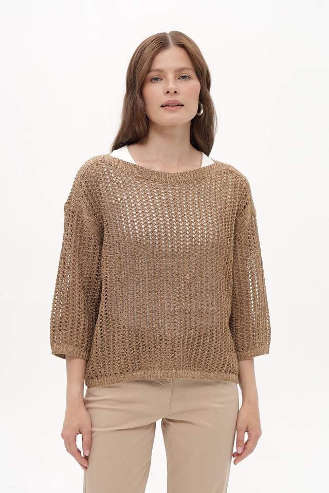 Пуловер имеет свободный крой и короткие рукава, что делает его идеальным для создания повседневных образов. Ажурное полотно позволяет коже дышать, обеспечивая комфорт даже в теплую погоду.