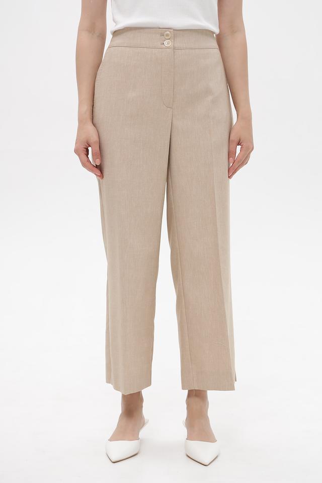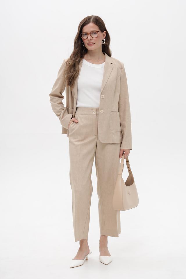 Брюки имеют классический крой с застежкой на две пуговицы и боковыми карманами. Состав ткани включает полиэстер, хлопок, вискозу, лен и эластан, что обеспечивает комфорт в носке, хорошую посадку и устойчивость к сминанию.
