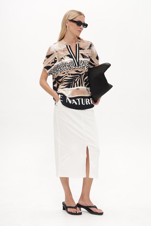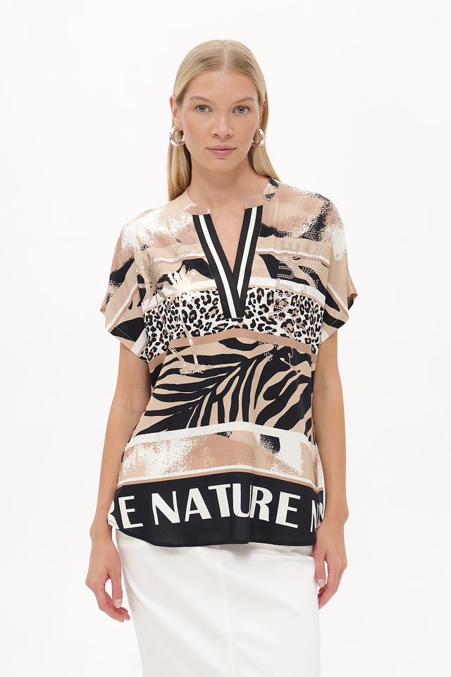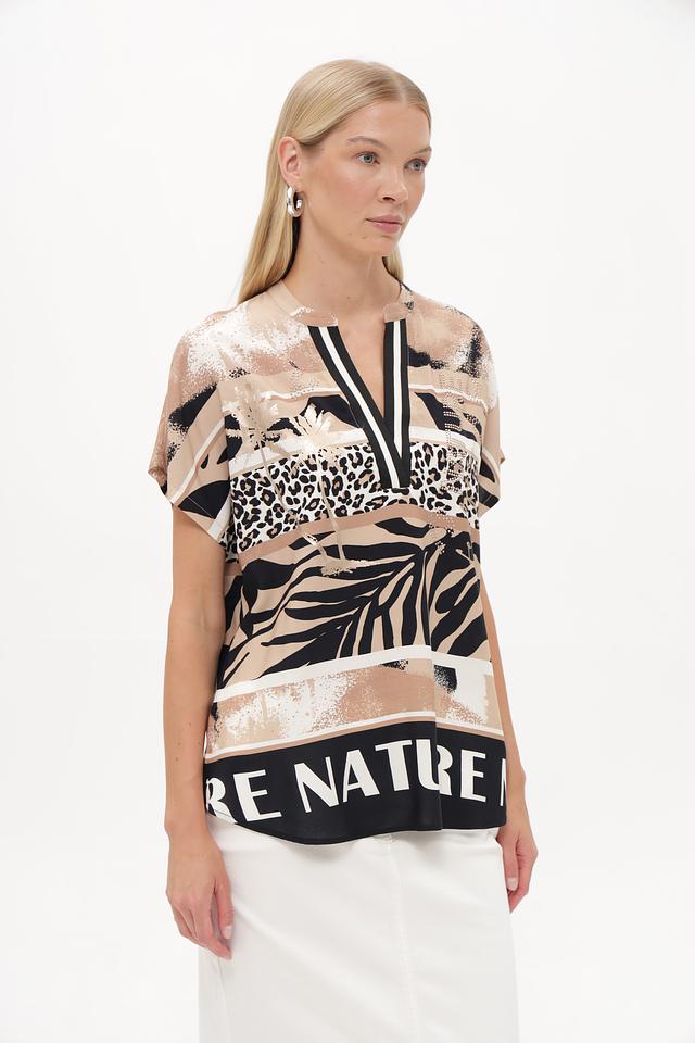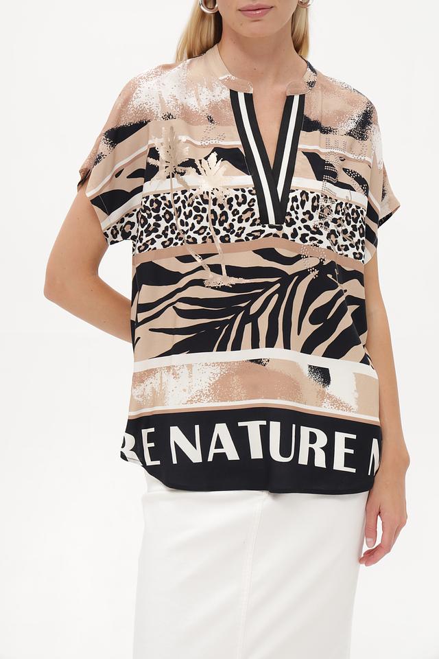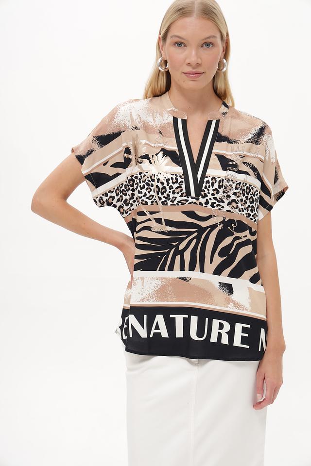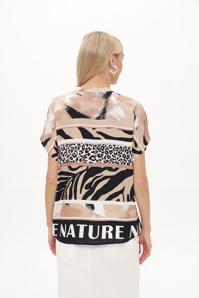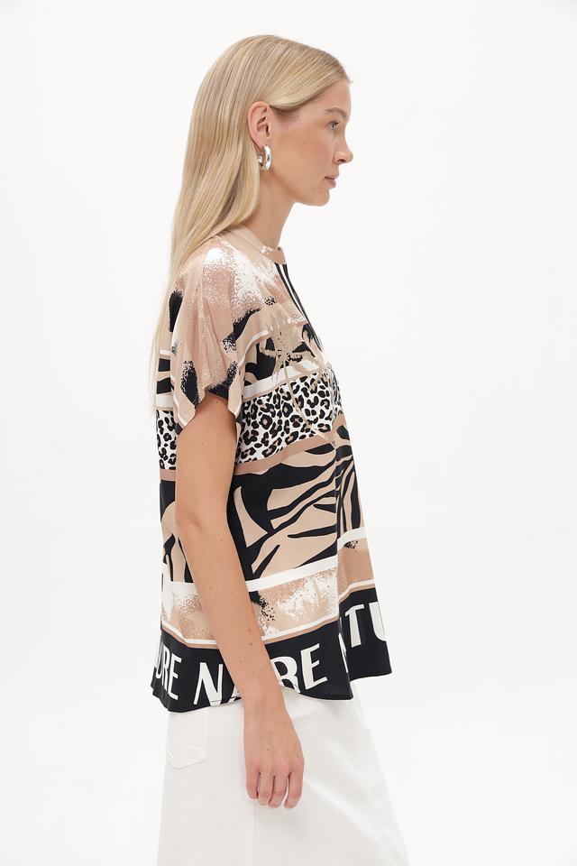 Блузка имеет свободный крой и короткие рукава, что делает её идеальным выбором для тёплой погоды. Особенностью модели является эффектный принт, сочетающий в себе анималистические мотивы (леопард, зебра) и графичные элементы.