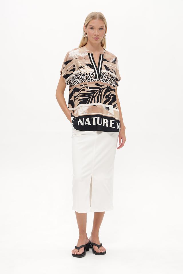 V-образный вырез горловины дополнен контрастной окантовкой. На передней части блузки расположена надпись "NATURE", добавляющая образу оригинальности. Блузка идеально сочетается с юбками, брюками и джинсами, позволяя создавать разнообразные стильные образы.