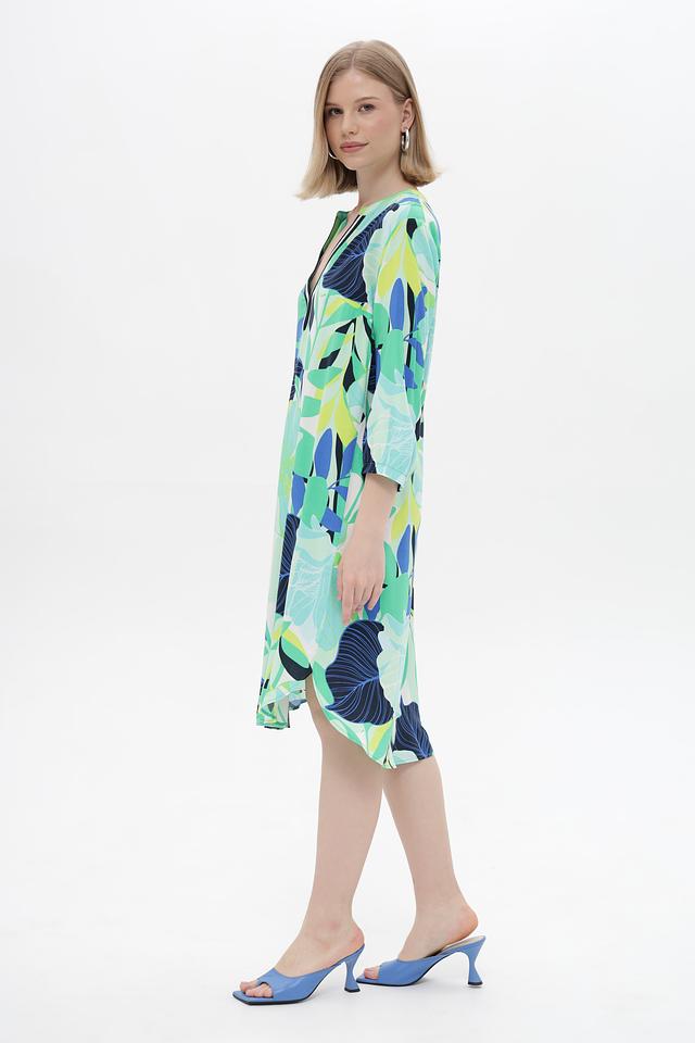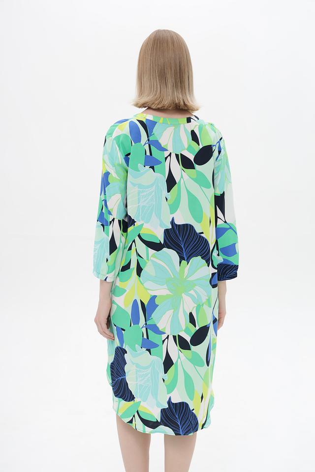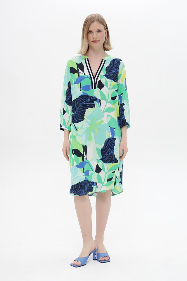 Платье имеет свободный крой, который не сковывает движения и подходит для разных типов фигур. V-образный вырез горловины подчеркивает элегантность силуэта, а рукава длиной 3/4 делают модель универсальной для любой погоды.